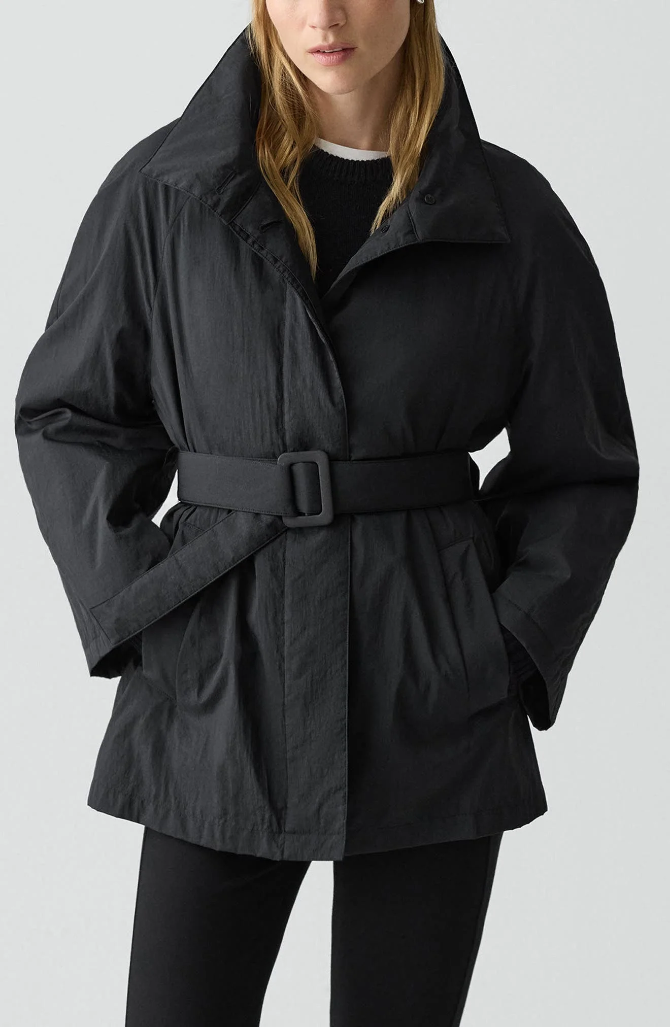 A matching belt provides a structured finish for a recycled-nylon parka that's equipped to handle the chill while staying perfectly chic. Hidden-button placket Stand collar Front welt pockets Removable belt Lined 100% recycled nylon Dry clean Imported