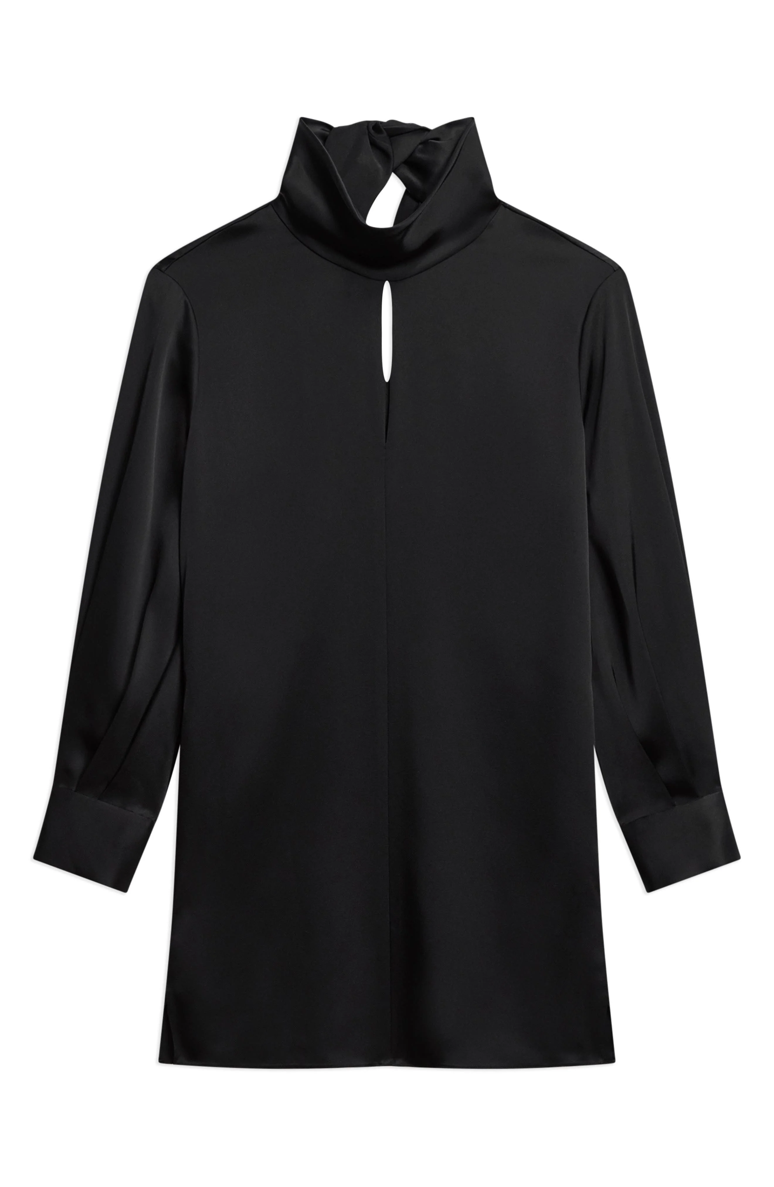 Get winter-ready chic in this satin mock-neck dress framed by softly gathered blouson sleeves and finished with a refined keyhole cutout. Mock neck Ties at neck Long sleeves Side slits 87% triacetate, 13% polyester Dry clean Made in Japan