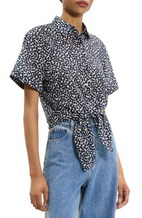Drapey front ties give a retro vibe to this button-up shirt featuring a bold geometric print. 30" length Front button closure Point collar Short sleeves 100% recycled polyester Dry clean Imported