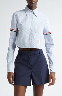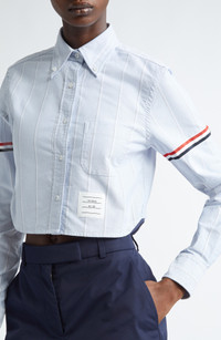 Thom Browne's signature varsity stripes encircle the upper biceps of a crisp cotton-poplin shirt refreshed in a boxy, cropped silhouette. Front button closure Button-down collar Long sleeves with button cuffs Chest patch pocket Curved hem 100% cotton Dry clean Made in Italy Designer Clothing