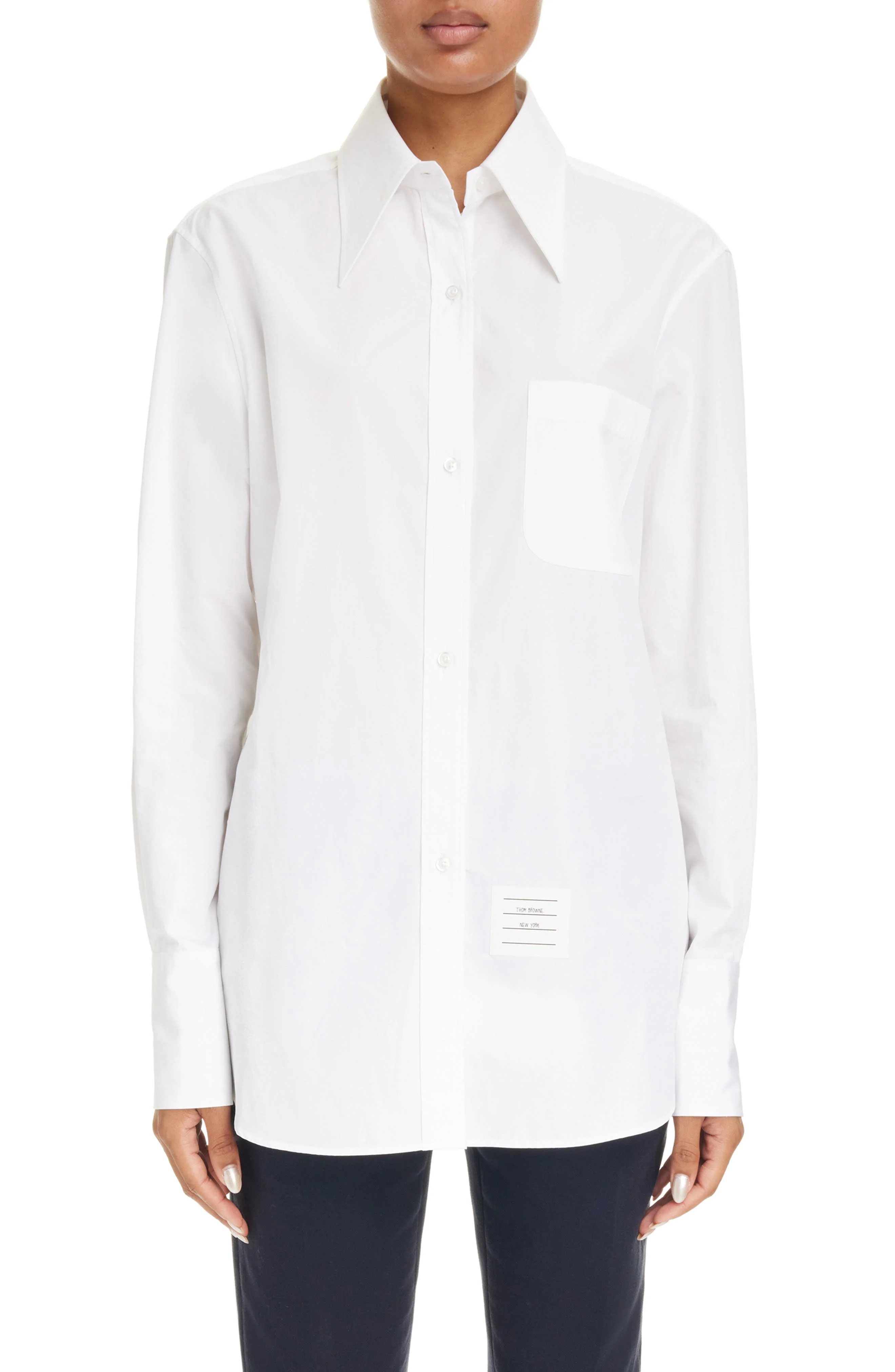 Pure cotton brings a soft hand to the tailored, signature look of this button-up shirt with an exaggerated point collar and name-tag patch above the hem. 31 1/2" length (size 44IT) Front button closure Point collar Long sleeves with button cuffs Chest patch pocket 100% cotton Dry clean or machine wash, line dry Made in Italy Designer Clothing