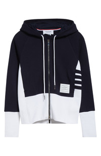 Varsity-inspired stripes at the left sleeve play up the sporty look of a cotton French terry hoodie contrasted with ribbed panels for enhanced comfort and mobility. Customary Thom Browne touches like tricolor accents and a school-style name tag complete the preppy look. Two-way front-zip closure Drawstring hood Side-seam pockets 100% cotton Dry clean Made in Japan Designer Clothing