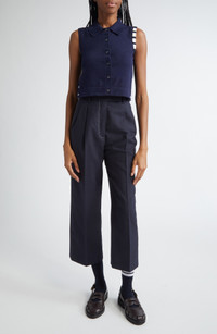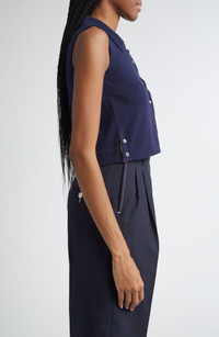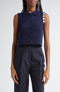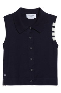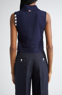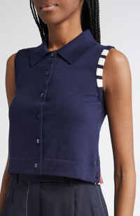 Varsity-inspired four-bar stripes and tricolor grosgrain trim bring Thom Browne's quintessential preppy touch to this cropped cotton polo with side vents that unbutton to signature red, white and blue stripes. Front button closure Rib collar Sleeveless Ribbed cuffs and hem Button side vents 100% cotton Dry clean Made in Italy Designer Clothing