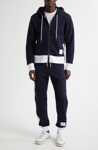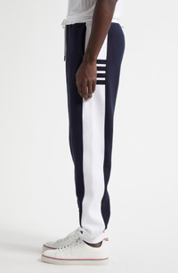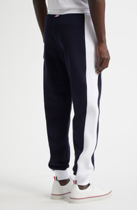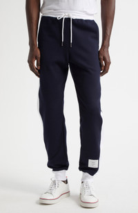 Varsity-inspired stripes at the left leg play up the sporty style of cotton French terry joggers designed with ribbed panels for enhanced comfort and mobility. Customary Thom Browne touches like a tricolor loop tab and school-style badge complete the preppy look. Elastic/drawstring waist Side-seam pockets 100% cotton Dry clean Made in Japan Designer Clothing