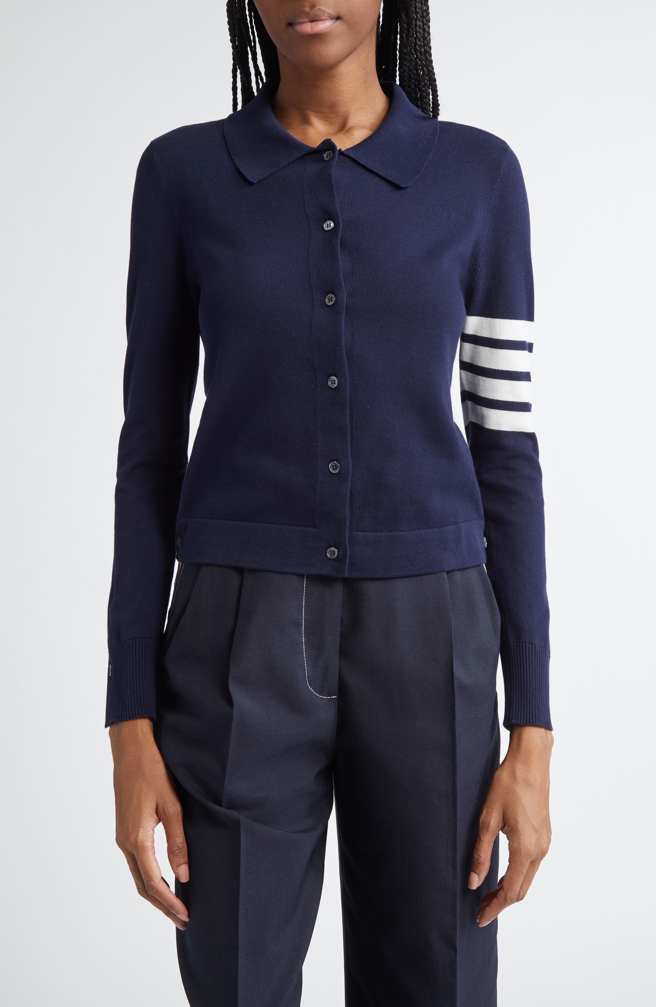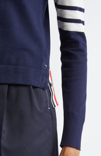 House-signature 4-Bar stripes and button-shut side slits revealing peeks of the label's varsity motif add understated heritage touches to this soft cotton cardigan. Front button closure Spread collar Long sleeves with ribbed cuffs 100% cotton Dry clean Made in Italy Designer Clothing