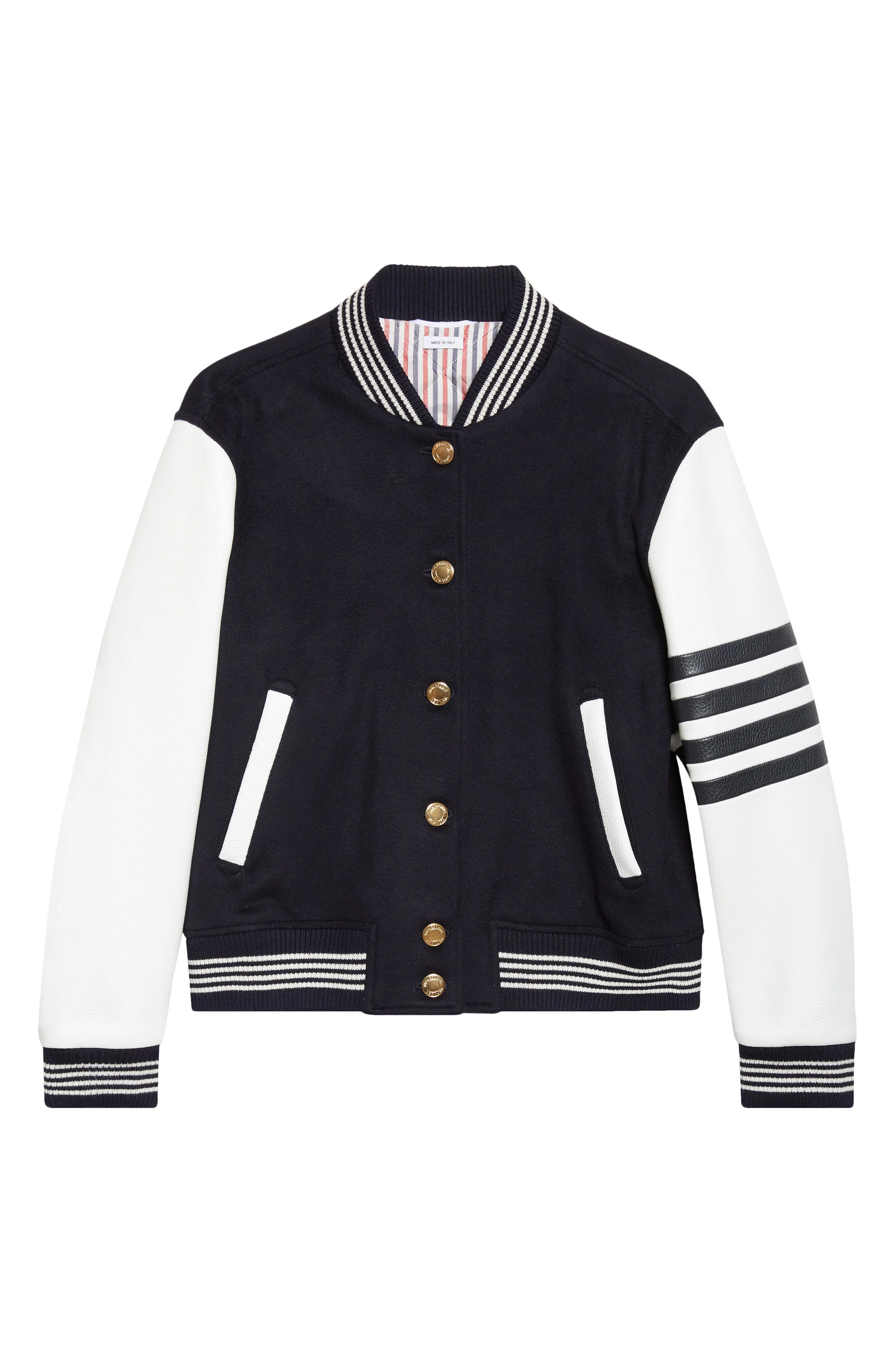 The classic varsity jacket—done here in a mix of felted wool, leather and rib trim—gets the Thom Browne treatment with house signature 4-Bar stripes and a tricolor grosgrain loop at the nape. Front button closure Blade collar Ribbed cuffs and hem Front snap-welt pockets Silk lining 100% wool with leather contrast Dry clean Made in Italy Designer Clothing