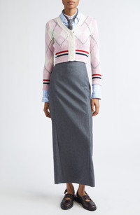 In typical Thom Browne fashion, red, white and blue stripes star in contrast trim on this shrunken wool-blend cardigan with a preppy argyle pattern steeped in the season's theme of countryside nostalgia. Front button closure V-neck Long sleeves Ribbed cuffs and hem Button side vents 97% virgin wool, 3% polyamide Dry clean Made in Italy Designer Clothing