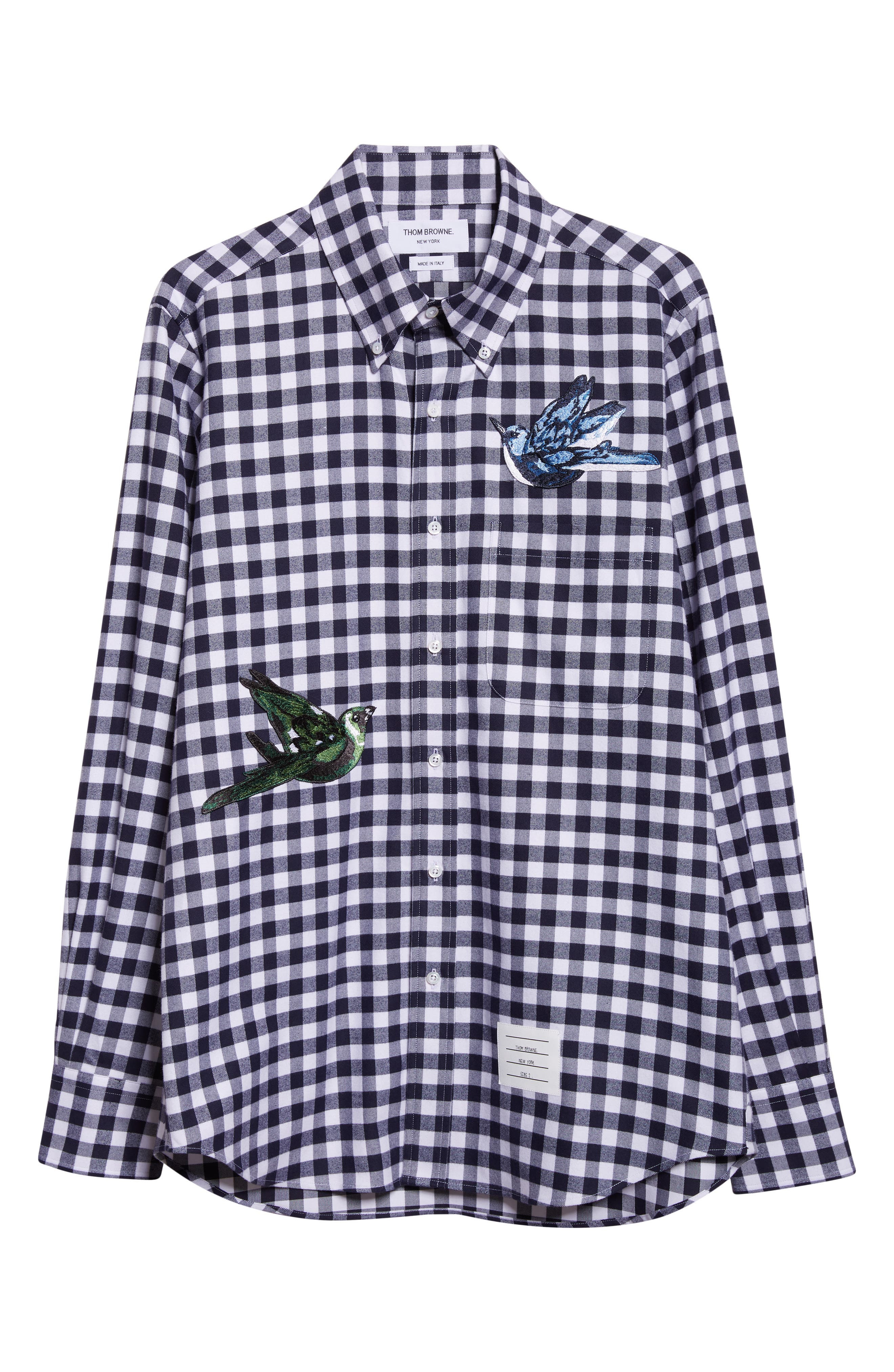 Thom Browne Bird Appliqué Gingham Straight Fit Cotton Flannel Button-Down Shirt in Navy at Nordstrom