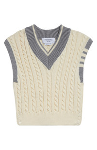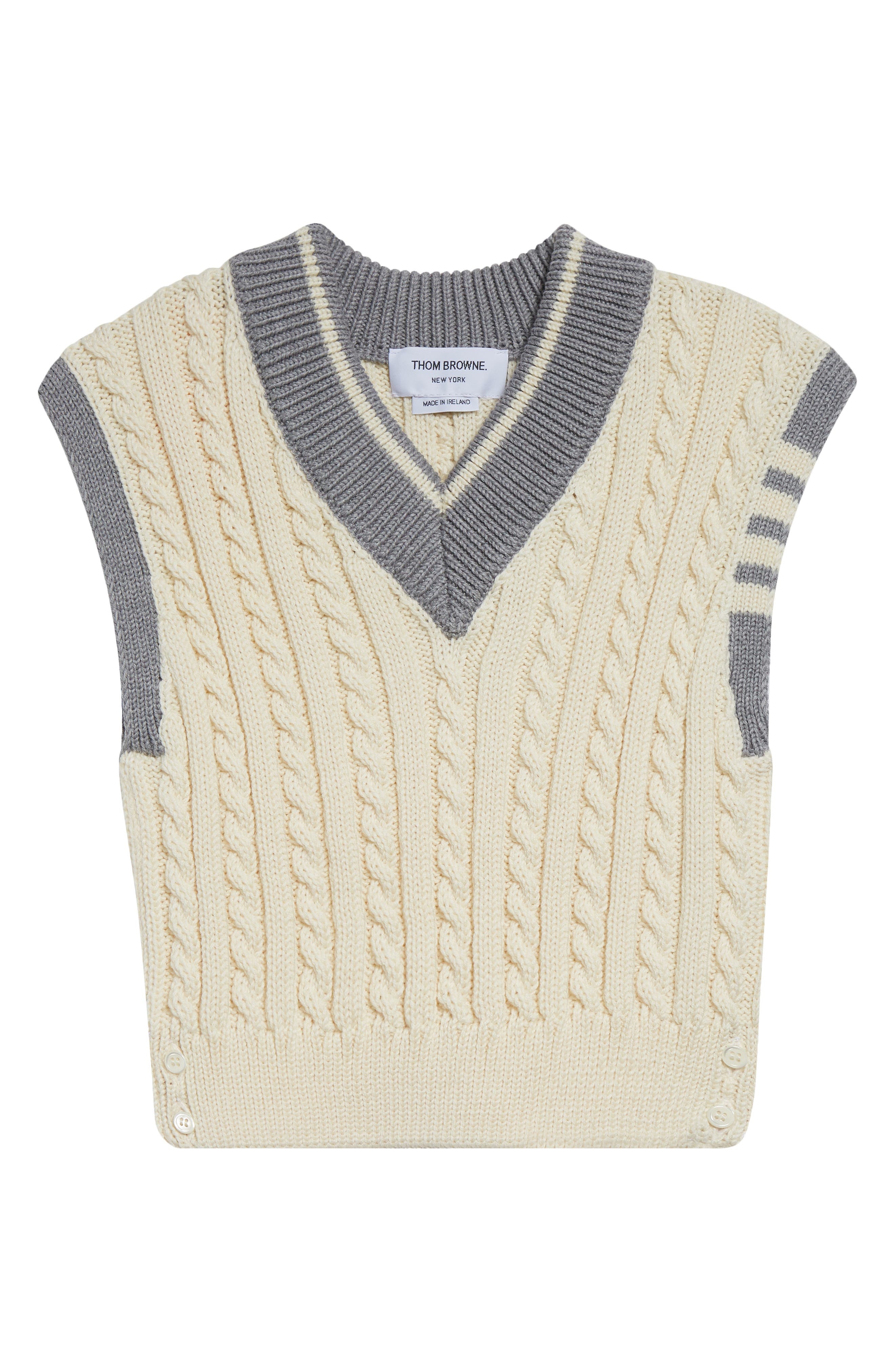 Thom Browne's signature stripes add a heritage touch to this cropped cable-knit sweater-vest masterfully crafted in Ireland from rich virgin-wool yarns. V-neck 100% virgin wool Dry clean Made in Ireland Designer Clothing