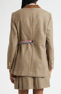 Thom Browne's signature shrunken fit and tricolor detail defines this check wool jacket that's paired with a removable vest cut from cotton corduroy. One-button closure Four-button cuffs Chest welt pocket; front flap pockets Removable vest has one-button closure; notched lapels; attached strap Cupro lining Jacket is 100% wool; vest is 100% cotton Dry clean Made in Italy Designer Clothing