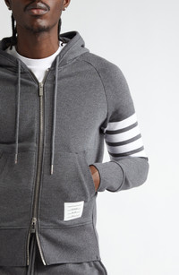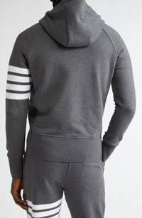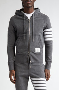 Engineered stripes at the left sleeve play up the sporty look of a cotton French terry hoodie featuring ribbed side panels for enhanced comfort and mobility. Tricolor aglets and a name tag at the hem are customary Thom Browne touches. 26" length (size 2) Drawstring hood Two-way front-zip closure Split kangaroo pocket Ribbed cuffs and hem 100% cotton Dry clean or hand wash, dry flat Made in Japan