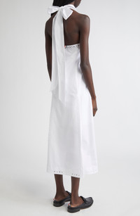 With Thom Browne’s innovative touch, this cotton-poplin polo dress becomes a standout in sartorial storytelling. A sharp button-down point collar anchors the look with classic refinement, while the deep open back reveals its dramatic secret: a cascading oversized bow that dances with every movement. Helm-inspired eyelet embroidery throughout adds a layer of intrigue, making this piece a bold tribute to Suzanne Lenglen, the tennis icon who redefined fashion with her fearless, groundbreaking aesthetic. Button half placket; ties at neck; hidden side-zip closure Button-down collar; halter neck Sleeveless, with cutaway shoulders Side vents 100% cotton Dry clean Made in Italy Designer Clothing