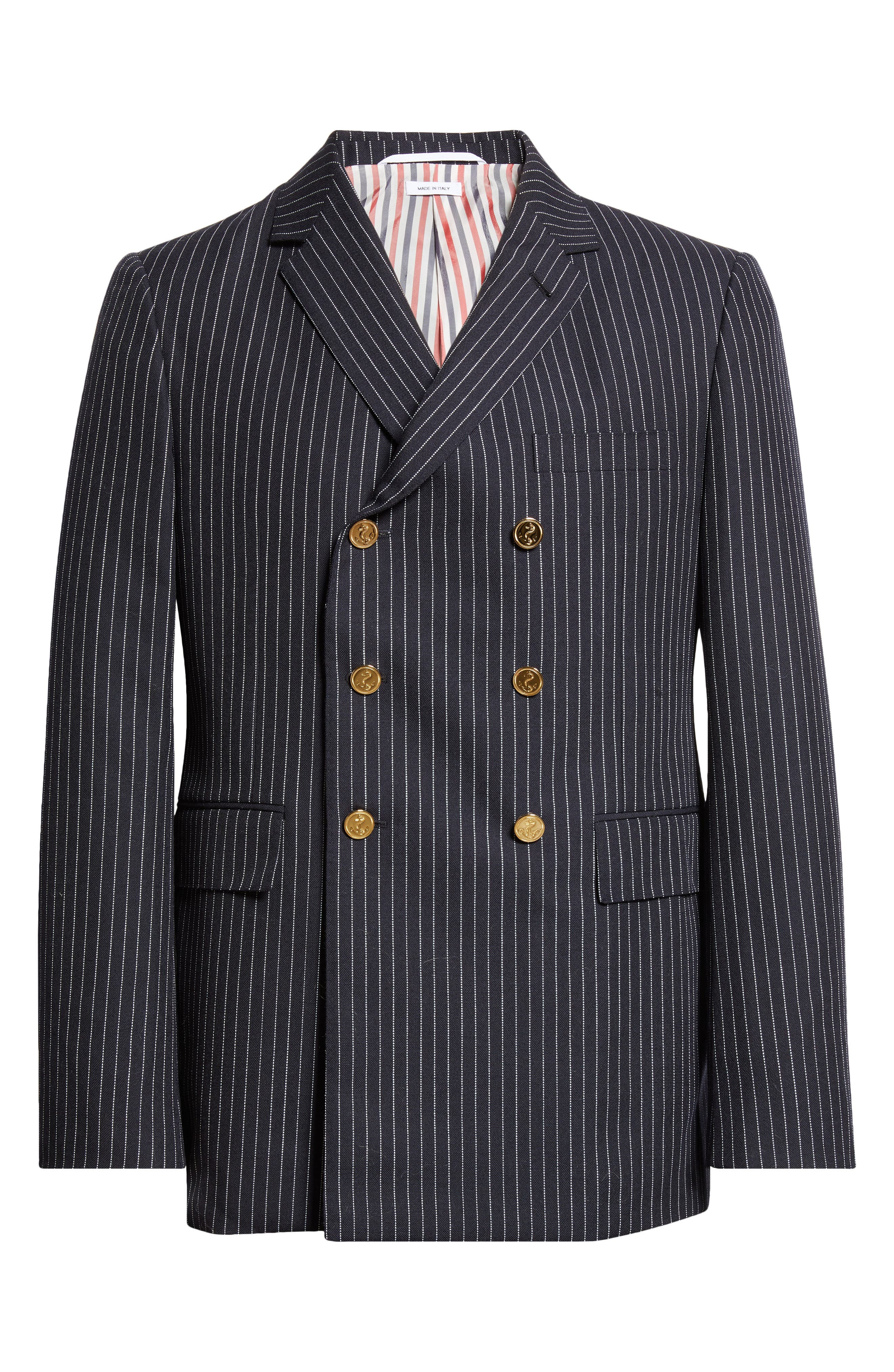 Tricolor trim at the cuffs and nape put Thom Browne's signature stamp on a double-breasted sport coat tailored in pinstriped wool gabardine in the label's iconic shrunken fit. Double-breasted button closure Notched lapels Four-button cuffs Chest welt pocket; front flap pockets Cupro lining 97% virgin wool, 3% polyester Dry clean Made in Italy Designer Clothing