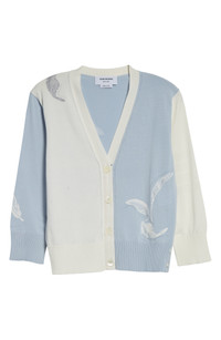 Feather motifs cascade gracefully down this cardigan, evoking the beauty of seasonal transitions. The label’s hallmark 4-bar stripes on one sleeve, rendered in intricate pointelle stitching, channel the discipline and heritage of collegiate sportswear. Front button closure V-neck Three-quarter sleeves with two-button cuffs Ribbed cuffs and hem Button side vents 100% cotton Dry clean Made in Italy Designer Clothing