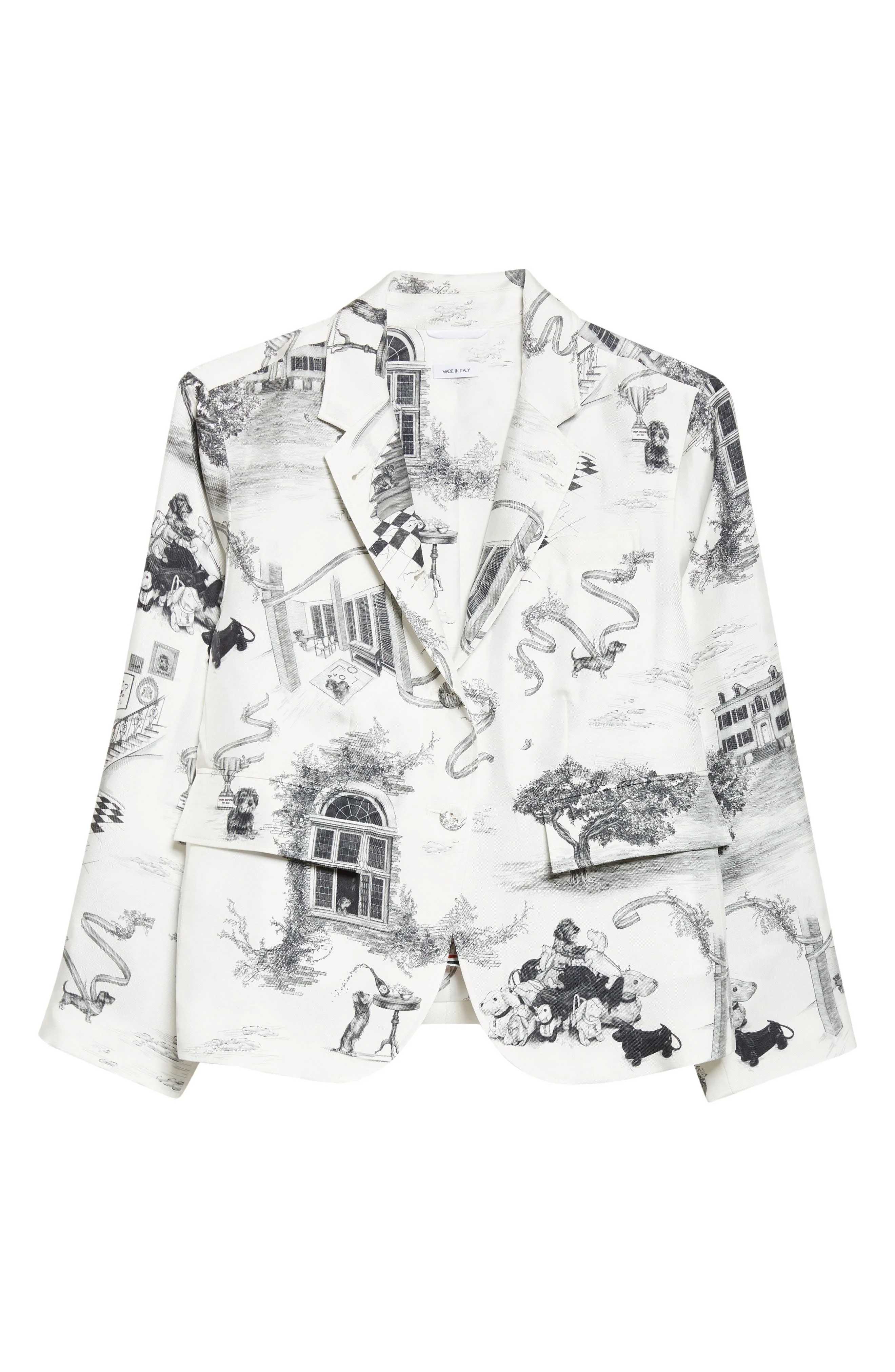 In celebration of Hector’s tenth year as a brand icon, this silk twill jacket features a highly personal tableau that is part portrait, part pastoral dream. The print draws elements from Thom Browne’s own upstate world, depicting the beloved dachshund in a series of whimsical vignettes across the piece’s tailored silhouette. A tricolor grosgrain loop at the back collar and ribbon inside the cuff plackets bring signature brand touches. Front button closure Notched lapels Bracelet-length sleeves with three-button cuffs Chest welt pocket; front flap pockets; three interior pockets Side back vents Silk lining 100% silk Dry clean Made in Italy Designer Clothing