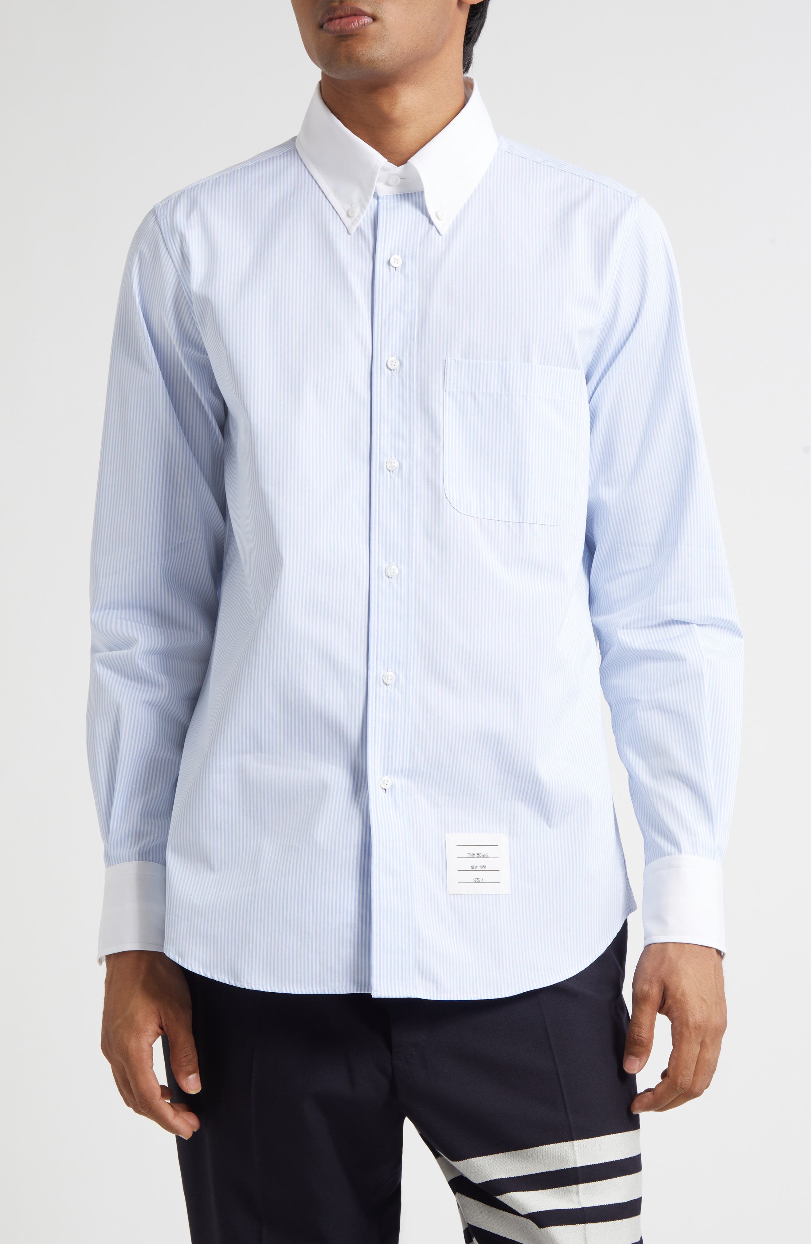Inspired by American country prep, this pinstriped cotton-poplin shirt takes a statement-making turn with a solid button-down collar and cuffs. Peek inside the cuff for the label’s iconic grosgrain trim—proof that the details are everything. Front button closure Button-down collar Long sleeves with adjustable button cuffs Chest patch pocket 100% cotton Dry clean Made in Italy Designer Clothing