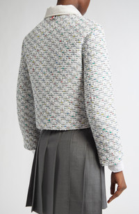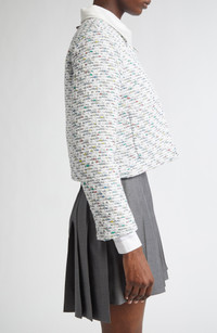 A tricolor grosgrain loop puts the label's stamp on this boxy cropped jacket sewn from sequin-flecked tweed and finished with a silk spread collar. Premium goose-down fill offers warmth without weight. Front zip closure Spread collar Front patch pockets Lined, with 85% goose-down, 15% polyester fill (Italy) 71% polyamide, 16% wool, 8% polyester, 5% viscose with 100% silk contrast Dry clean Made in Italy Designer Clothing