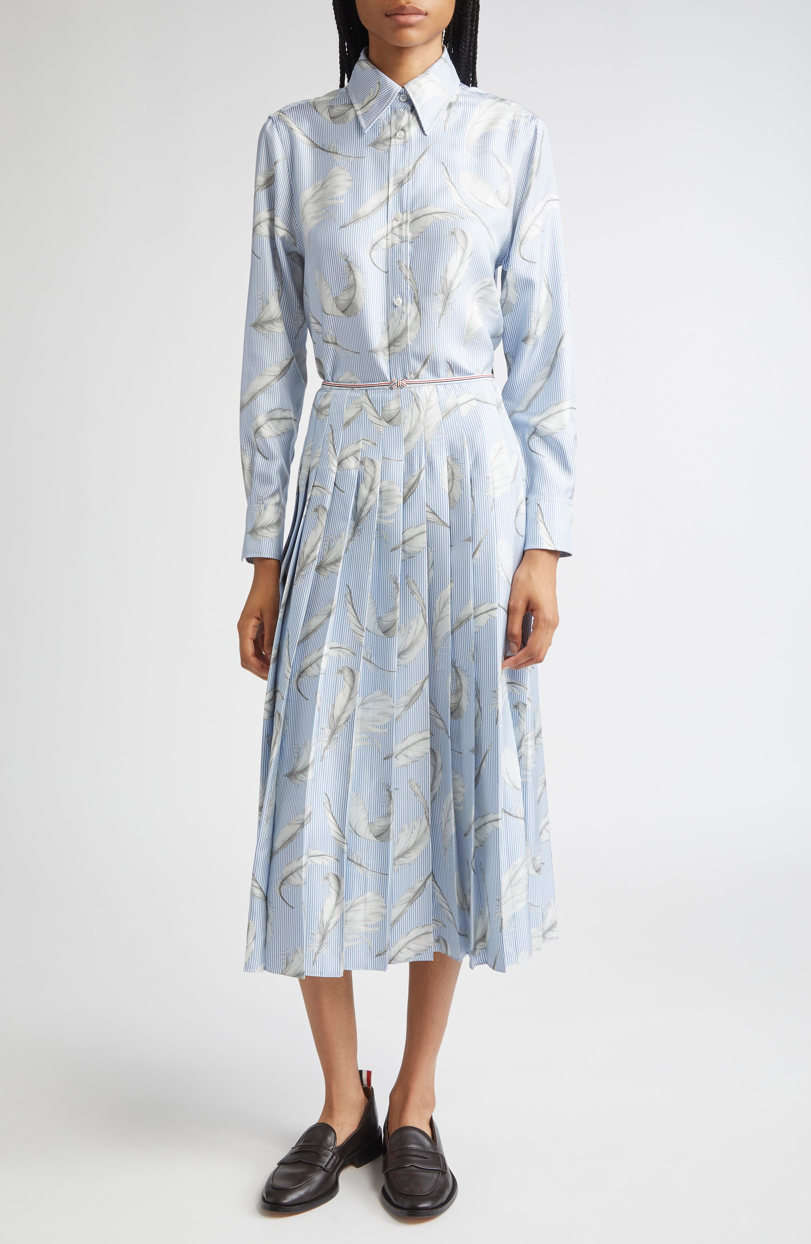 Thom Browne Pleated Feather Print Silk Twill Midi Skirt in Light Blue at Nordstrom