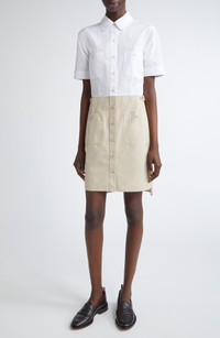 The slightly asymmetric hem seen throughout the label's 2025 collection makes an appearance in this two-toned shirtdress flanked by button-front patch pockets. Front button closure Peter Pan collar Short sleeves Front button-patch pockets 65% polyester, 35% cotton Dry clean Made in Italy Designer Clothing
