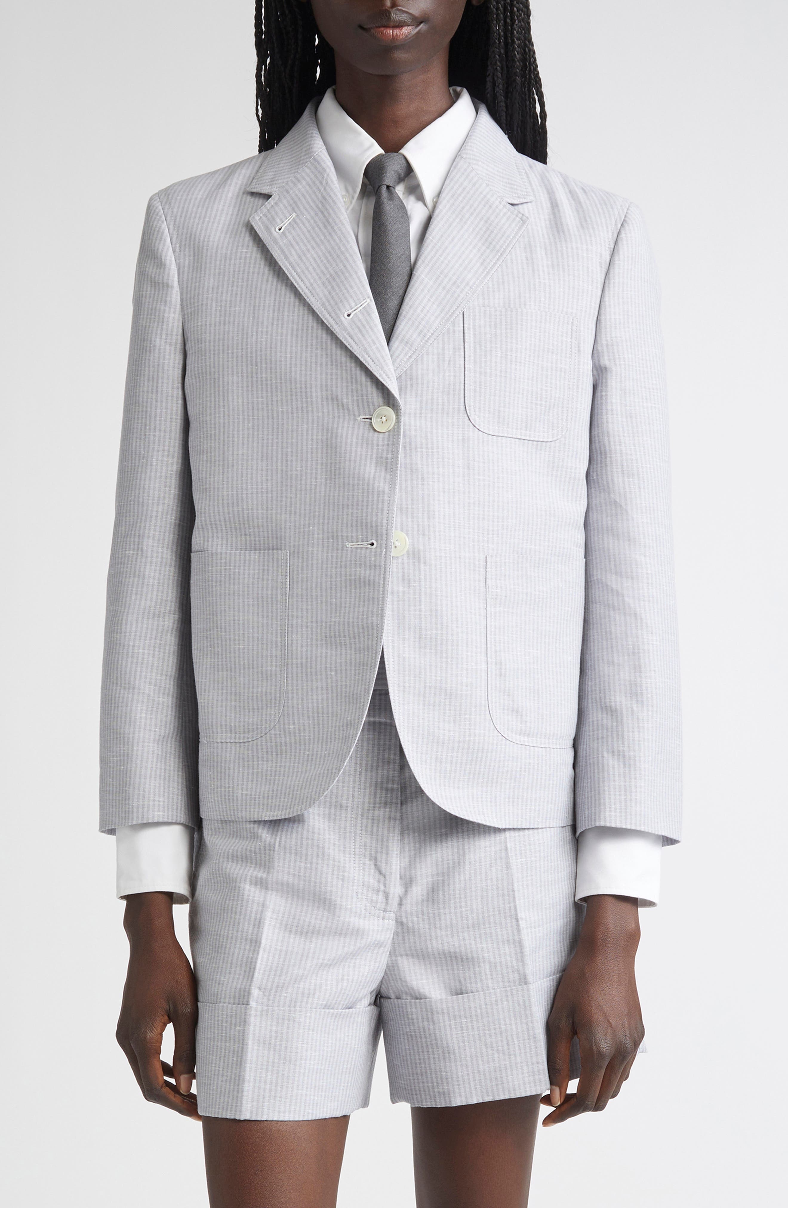Thom Browne Stripe Linen & Cotton Sack Crop Blazer in Light Grey at Nordstrom