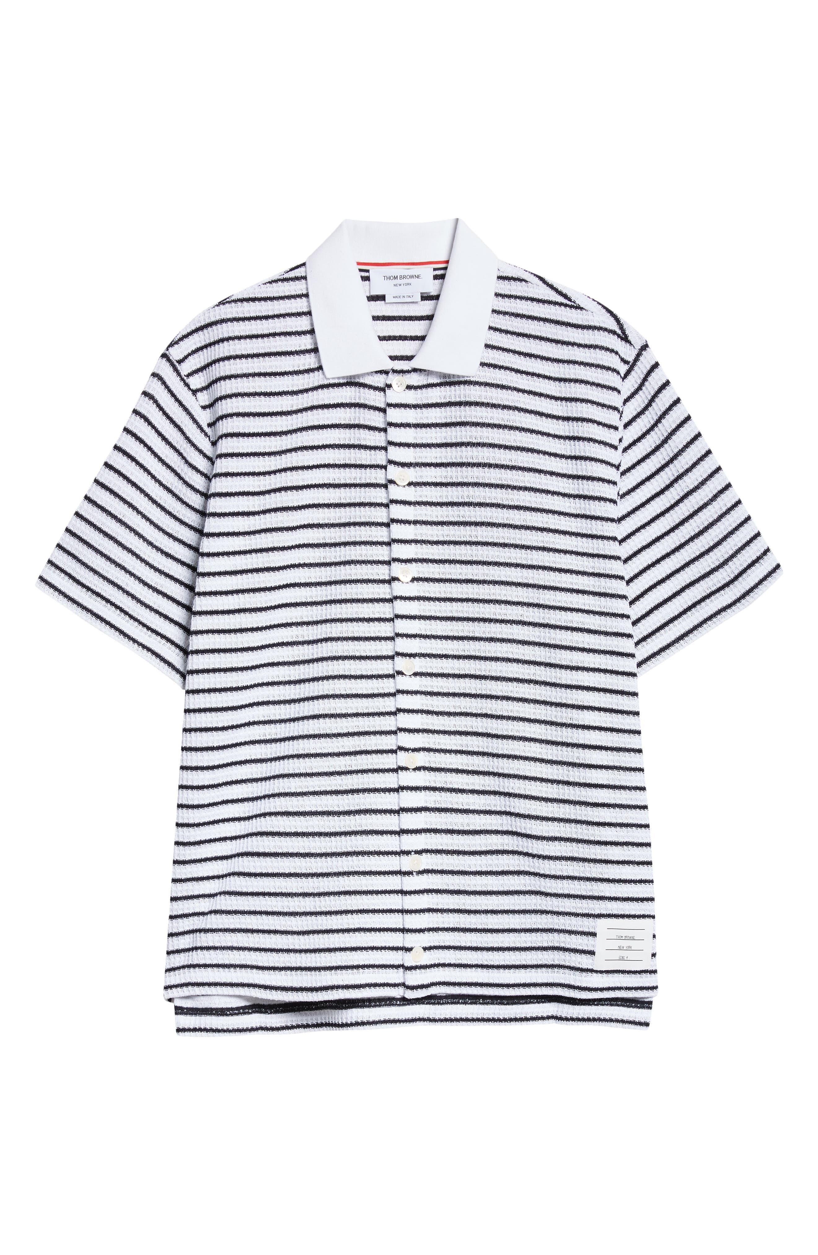A grosgrain loop at the back collar and uniform-inspired name tag bring Thom Browne flair to this short-sleeved button-up shirt refreshed in a soft cotton knit. Front button closure Spread collar Short sleeves 100% cotton Dry clean Made in Italy Designer Clothing