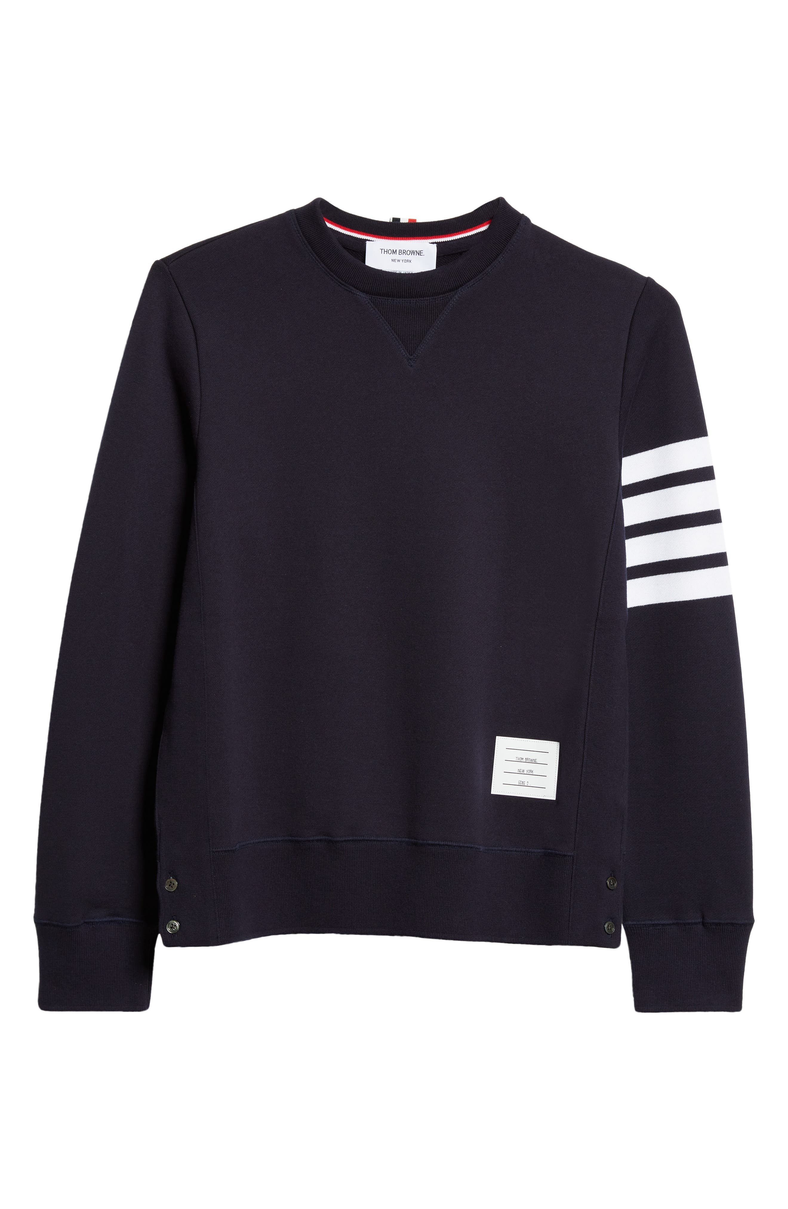 A quartet of thick stripes bands one arm of a well-appointed cotton sweatshirt replete with dapper details like a signature logo patch and a buttoned split hem. 25" length (size 2) Side button closure Crewneck Long sleeves with ribbed cuffs 100% cotton Dry clean Made in Japan