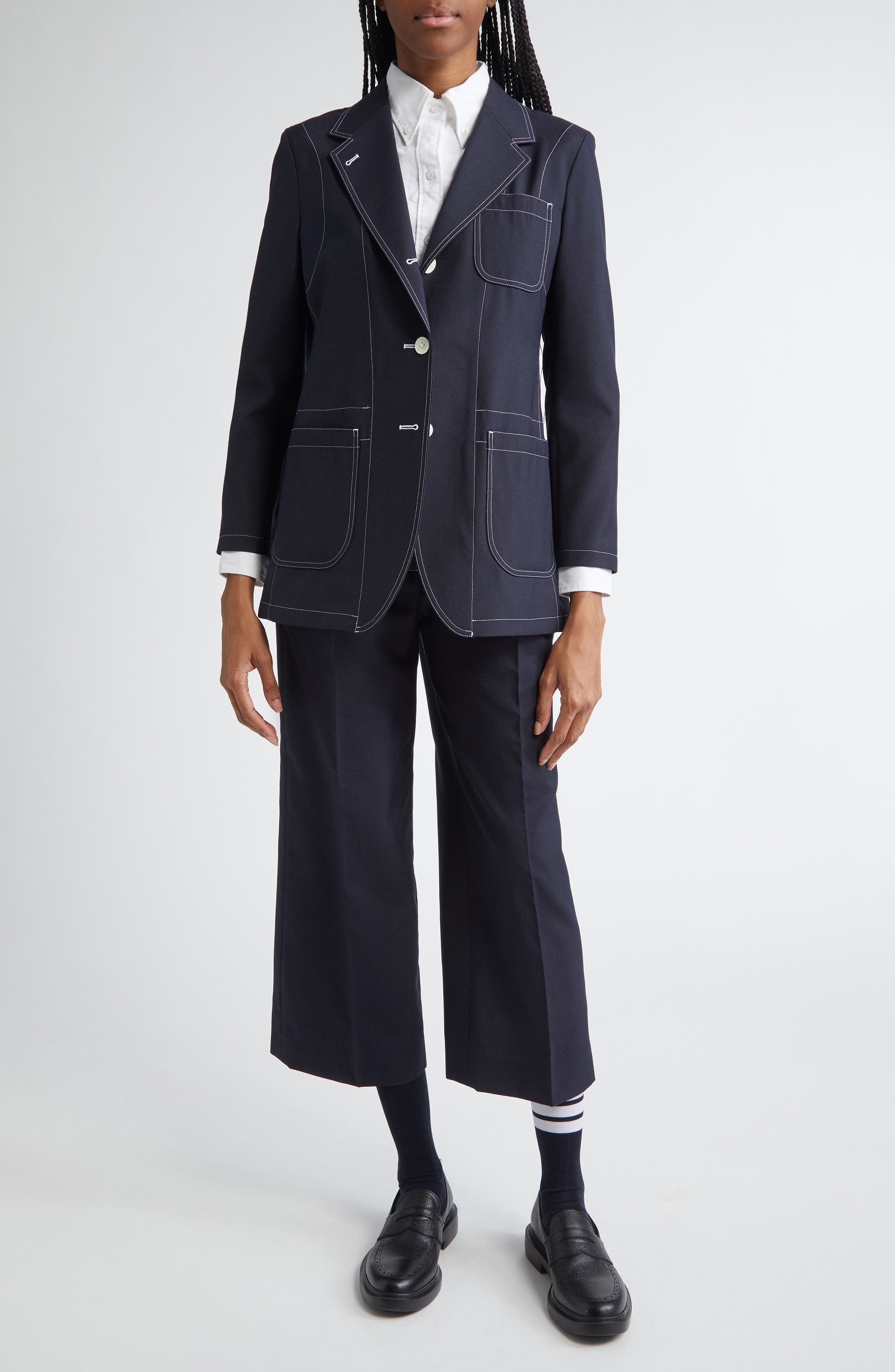 Tricolor grosgrain trim at the cuffs and back collar puts the label's signature stamp on this wool-blend longline blazer highlighted with contrast topstiching. Front button closure Notched lapels Four-button cuffs Chest patch pocket; front patch pockets Cupro lining 50% wool, 50% polyester Dry clean Made in Japan Designer Clothing