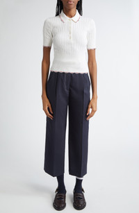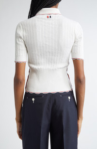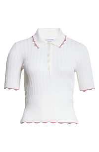 Scalloped tricolor trim brings Browne's signature touch to a pointelle-stitch polo knit in Italy from sumptuous silk and cotton. Button half placket; side button closure Spread collar Short sleeves 55% silk, 45% cotton Dry clean Made in Italy Designer Clothing