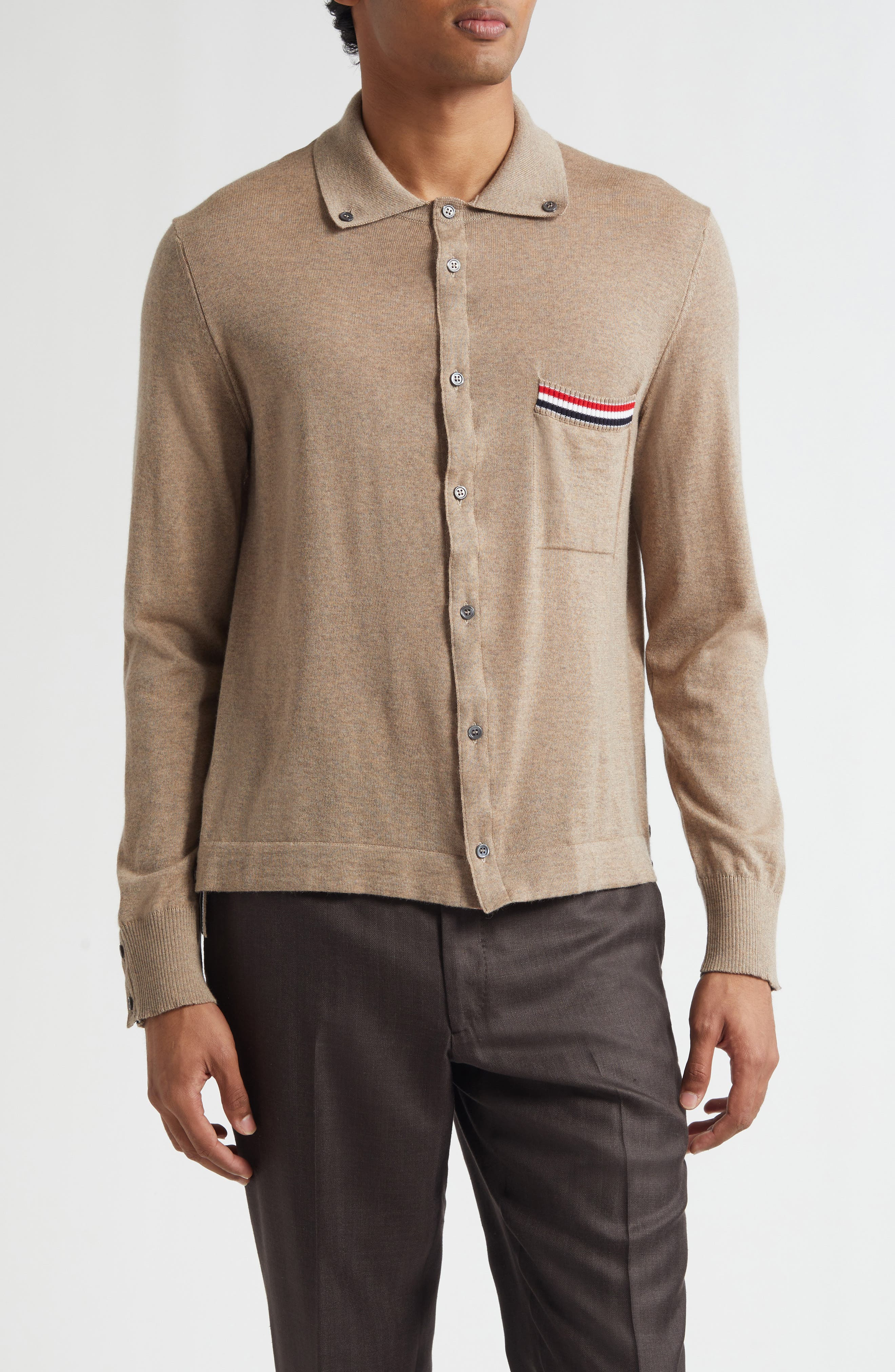 Tricolor trim at the placket, pocket and button cuffs brings a house-signature touch to this jersey-stitched wool cardigan refreshed with a button-down collar. Front button closure Button-down collar Long sleeves with button cuffs Chest patch pocket 100% virgin wool Dry clean Made in Italy Designer Clothing