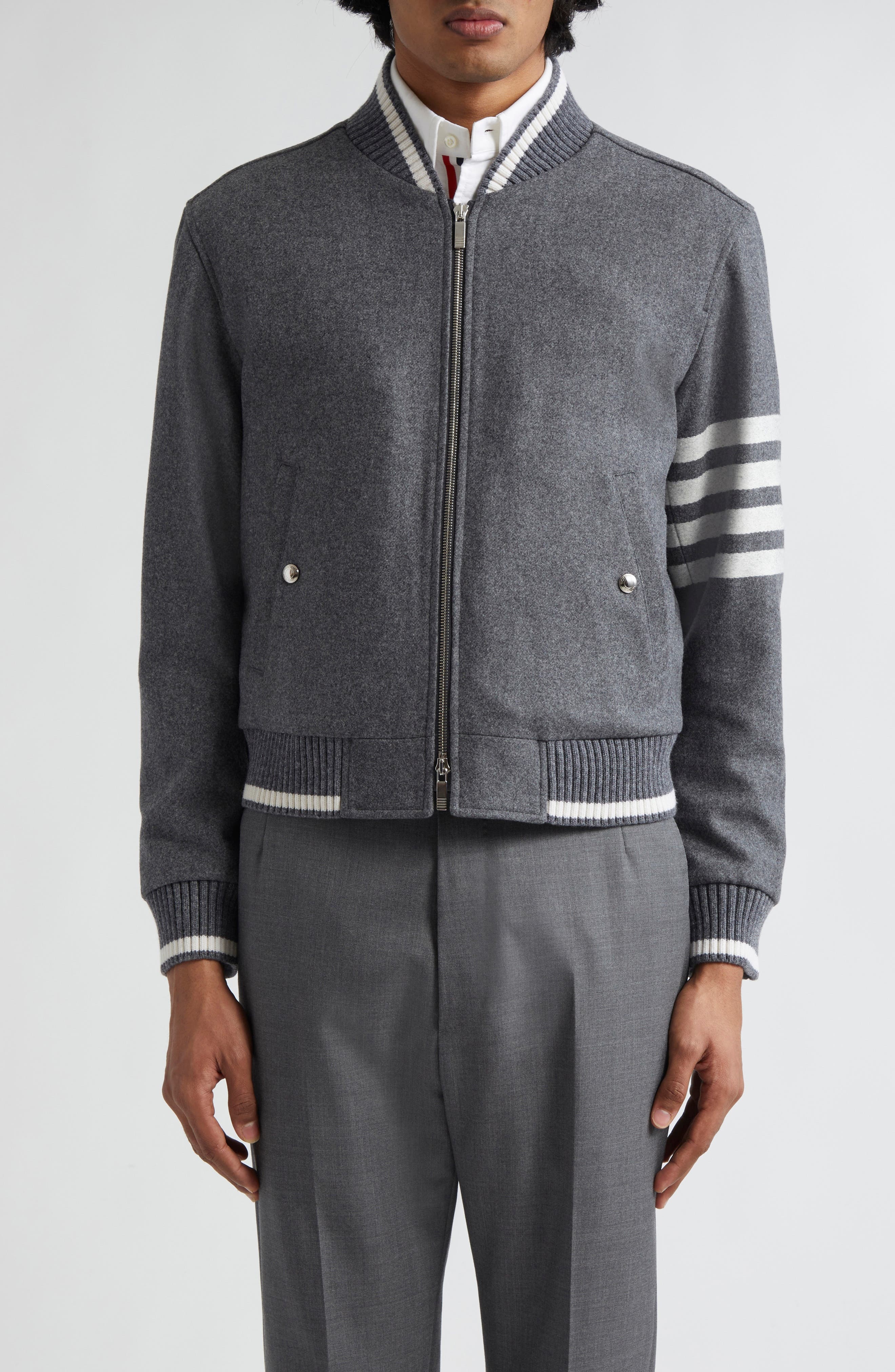 This classic wool bomber jacket is kissed with cashmere and designed with tipped sweater-gauge ribbing and the iconic 4-Bars encircling the left sleeve. 24" length (size 2) Two-way front-zip closure Blade collar Front snap welt pockets Ribbed cuffs and hem Stripe lining 95% wool, 5% cashmere Dry clean Made in Italy Designer Clothing