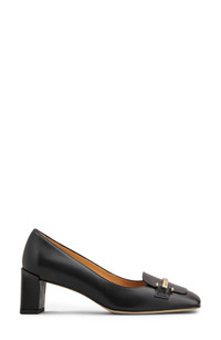 A logo-engraved bar bit bridges the cleanly structured vamp of a calfskin-leather pump set on a sturdy block heel. Leather upper, lining and sole Made in Italy Designer Shoes