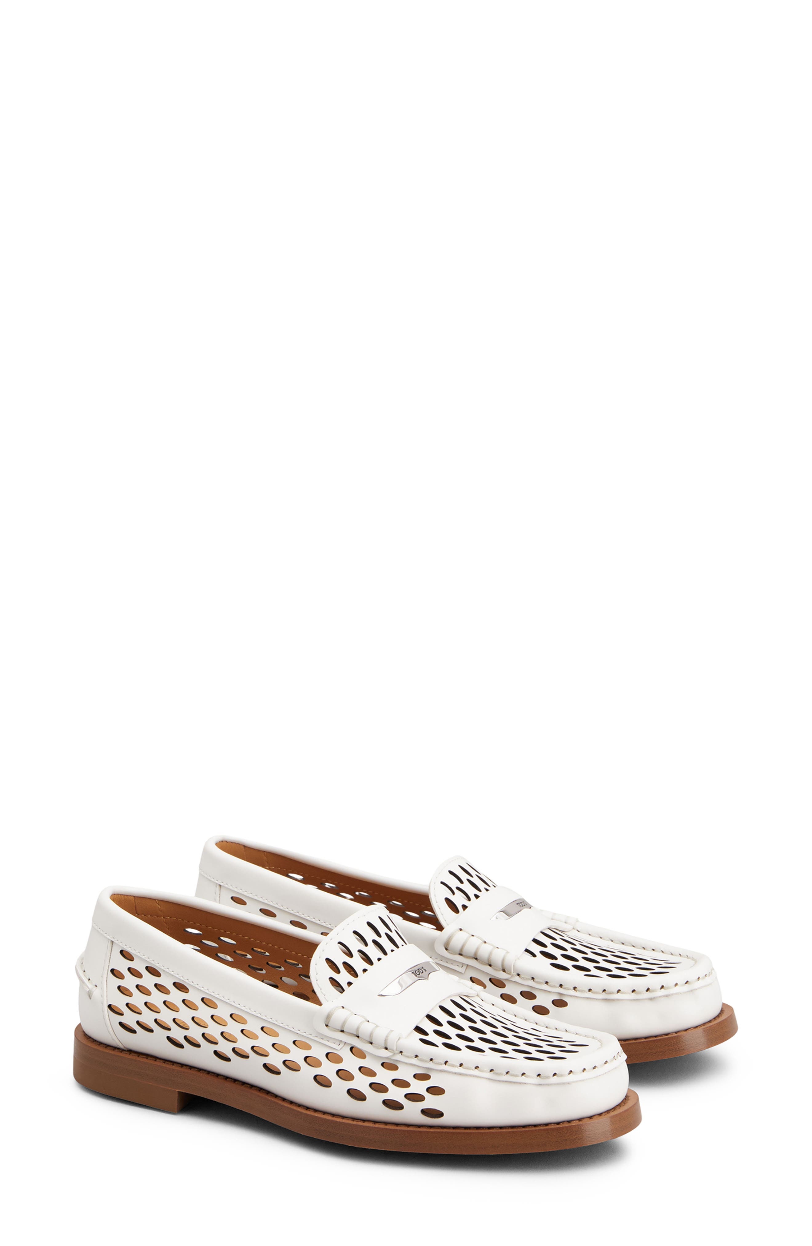 A penny keeper featuring a logo-engraved polished metal insert elevates this moc toe loafer in laser-cut perforated calfskin leather and set on a signature leather outsole with rubber-injection tread. Leather upper and lining/leather and rubber sole Made in Italy Designer Shoes