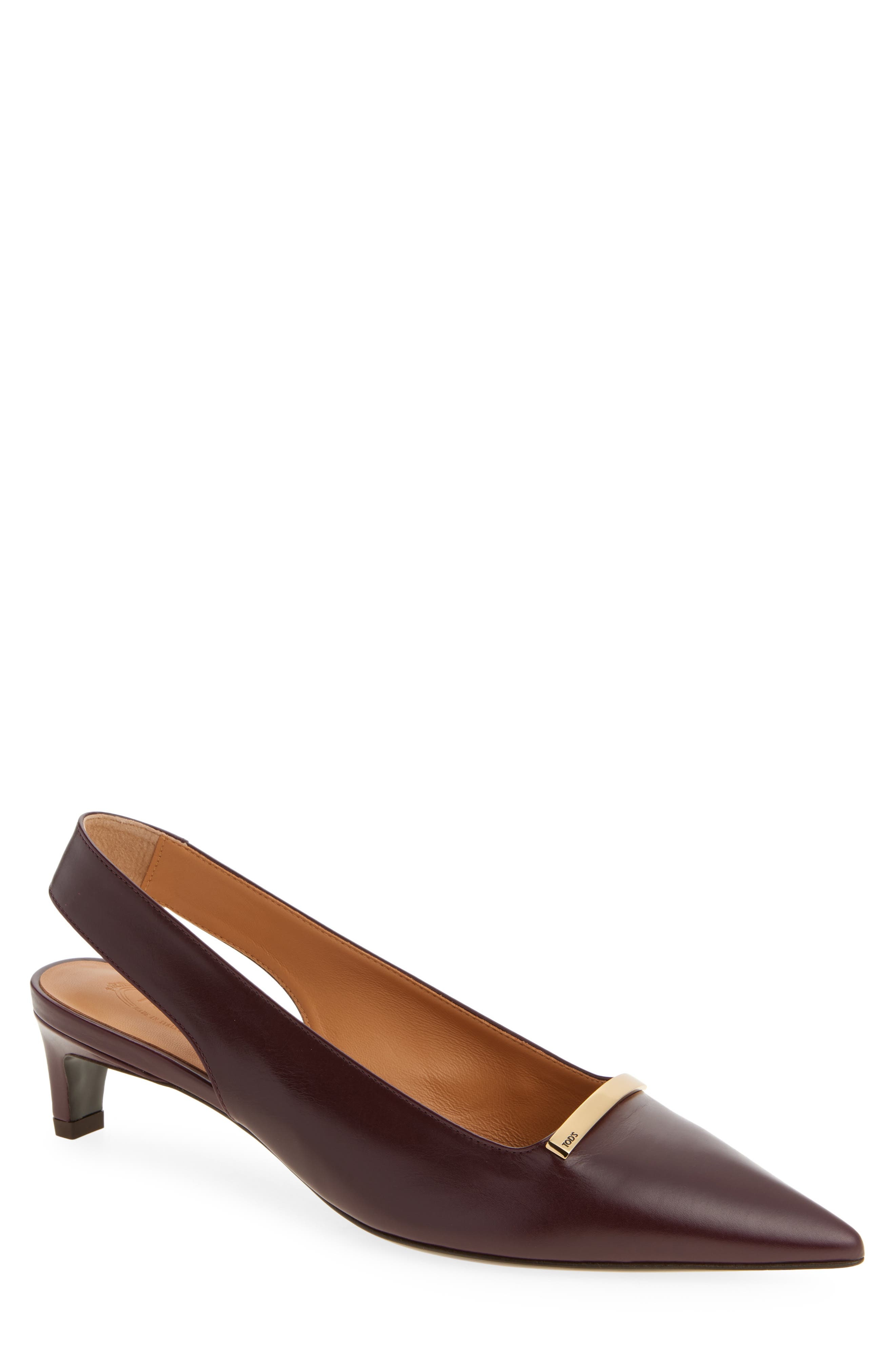 A logo-engraved metal bar tops the pointy toe of this elegantly minimalist slingback pump that's given sensible height by a wraparound kitten heel. 1 1/2" heel Slingback strap Leather upper, lining and sole Made in Italy Designer Shoes