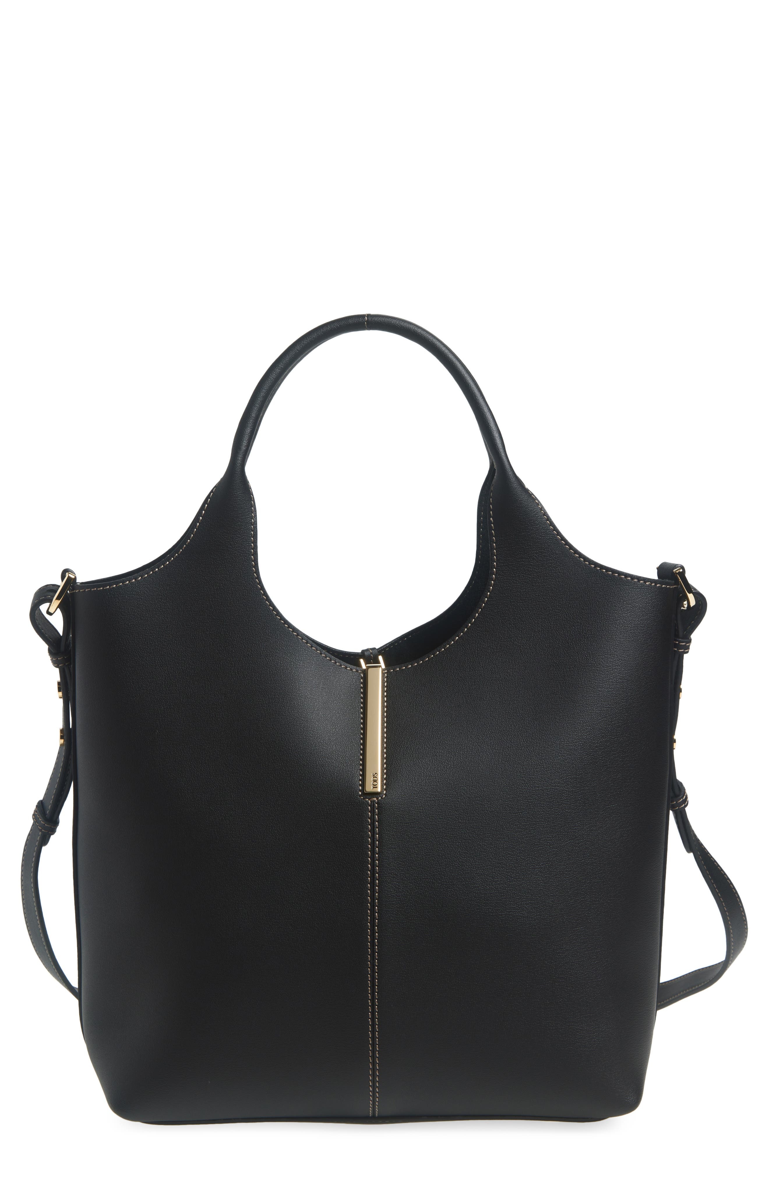 Logo-engraved hardware and contrast topstitching enrich a calfskin-leather tote conveniently fitted with several carrying options. Bridge-clip closure Top carry handle; removable, adjustable shoulder strap Lined Leather Made in Italy Designer Handbags
