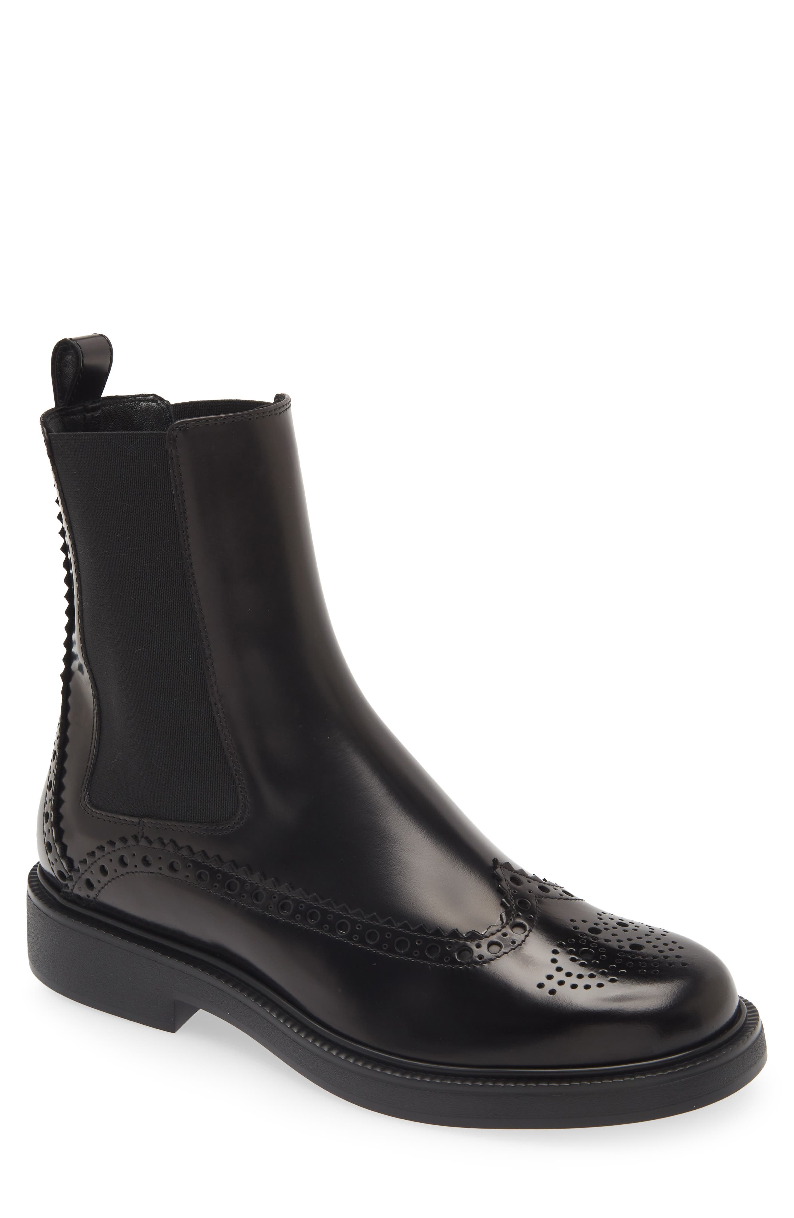 Ornate perforations and a classic wingtip toe highlight the label's dedication to timeless elegance in a sleek patent-leather Chelsea boot. Pull-on style Leather and textile upper and lining/rubber sole Imported Designer Shoes