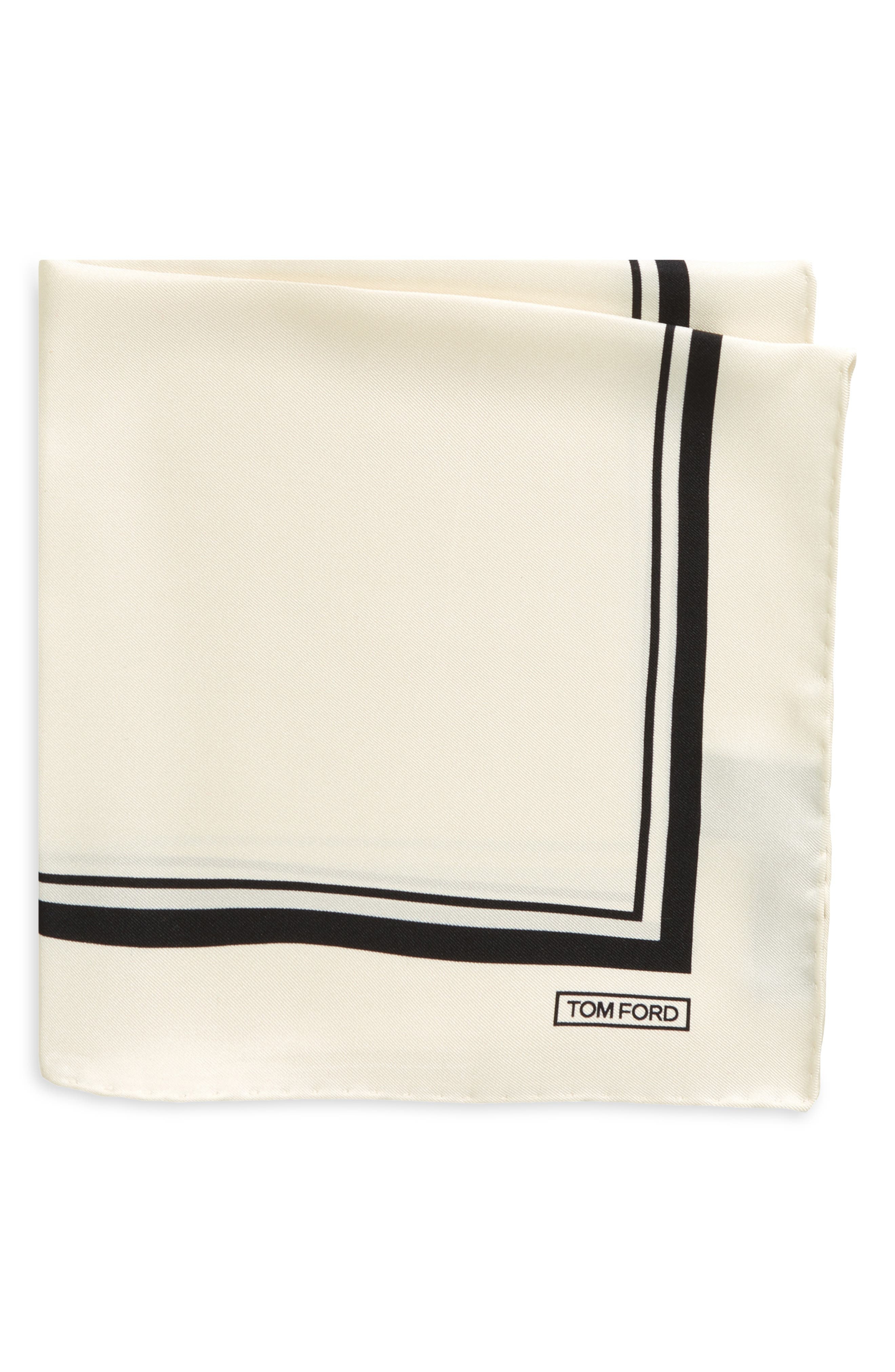 Creamy silk framed in dark navy details a pocket square styled to bring polish and distinction to any formal look. 100% silk Dry clean Made in Italy