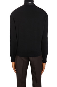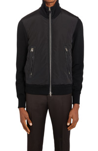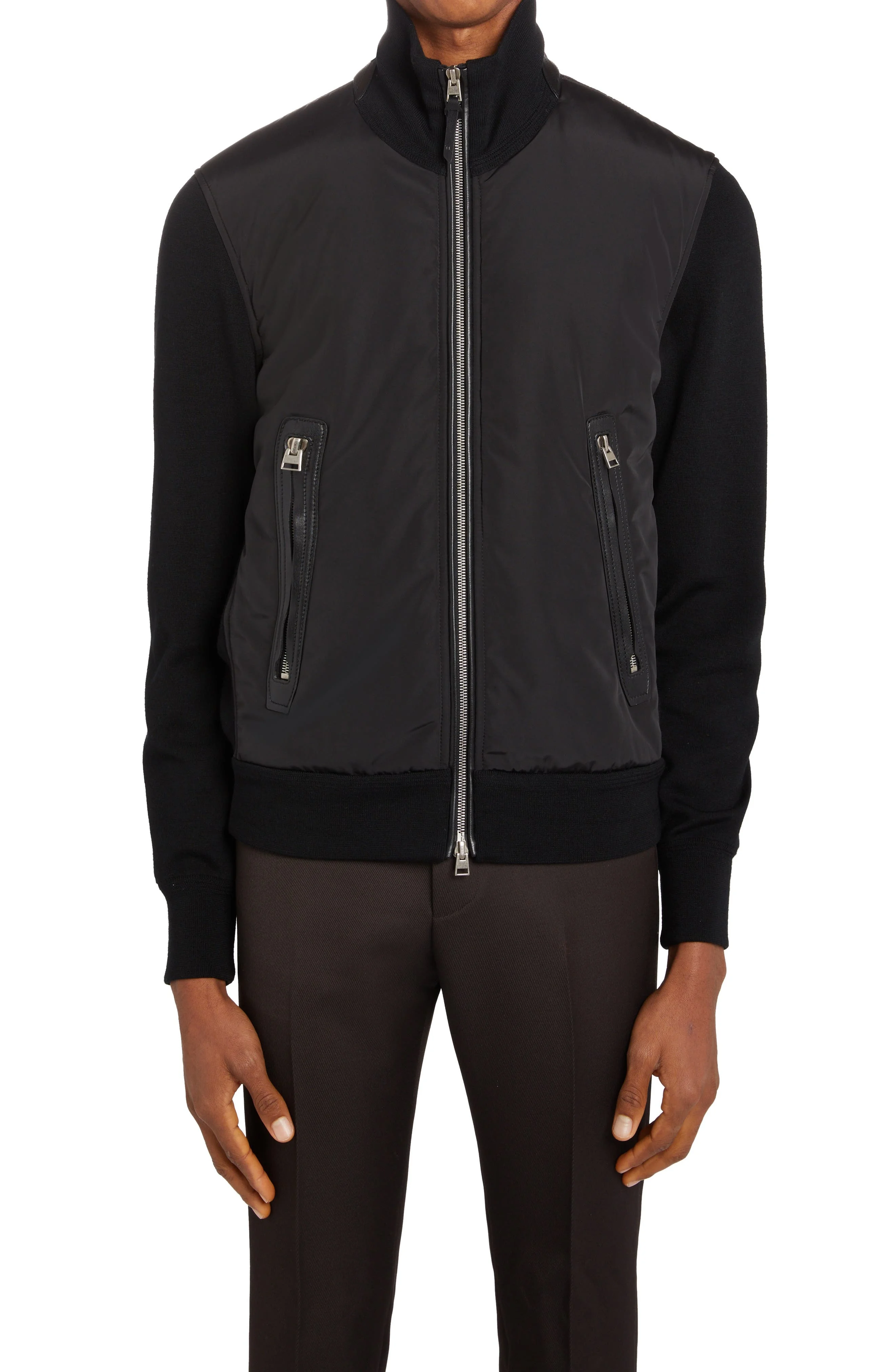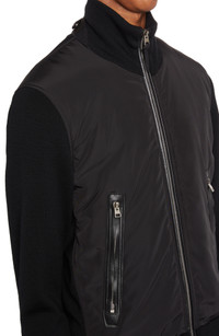 A satiny woven front brings mixed-media appeal to a virgin-wool zip sweater finished with lambskin-leather trim and a signature grab handle at the back. 25 1/2" length (size 38US/48EU) Two-way front zip closure Funnel neck Long sleeves with ribbed cuffs Front zip pockets Partially lined with polyester fill 100% wool with 100% polyester contrast and leather trim Professional leather clean Made in Italy Men's Designer Clothing