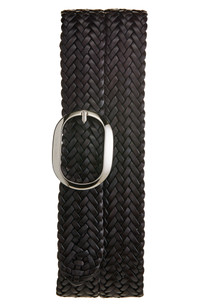 Narrow strips of calfskin leather are neatly woven together to form this easily adjustable belt centered with a polished oval buckle. 1" belt width; 1 1/2" x 2 1/4" buckle Leather Made in Italy
