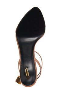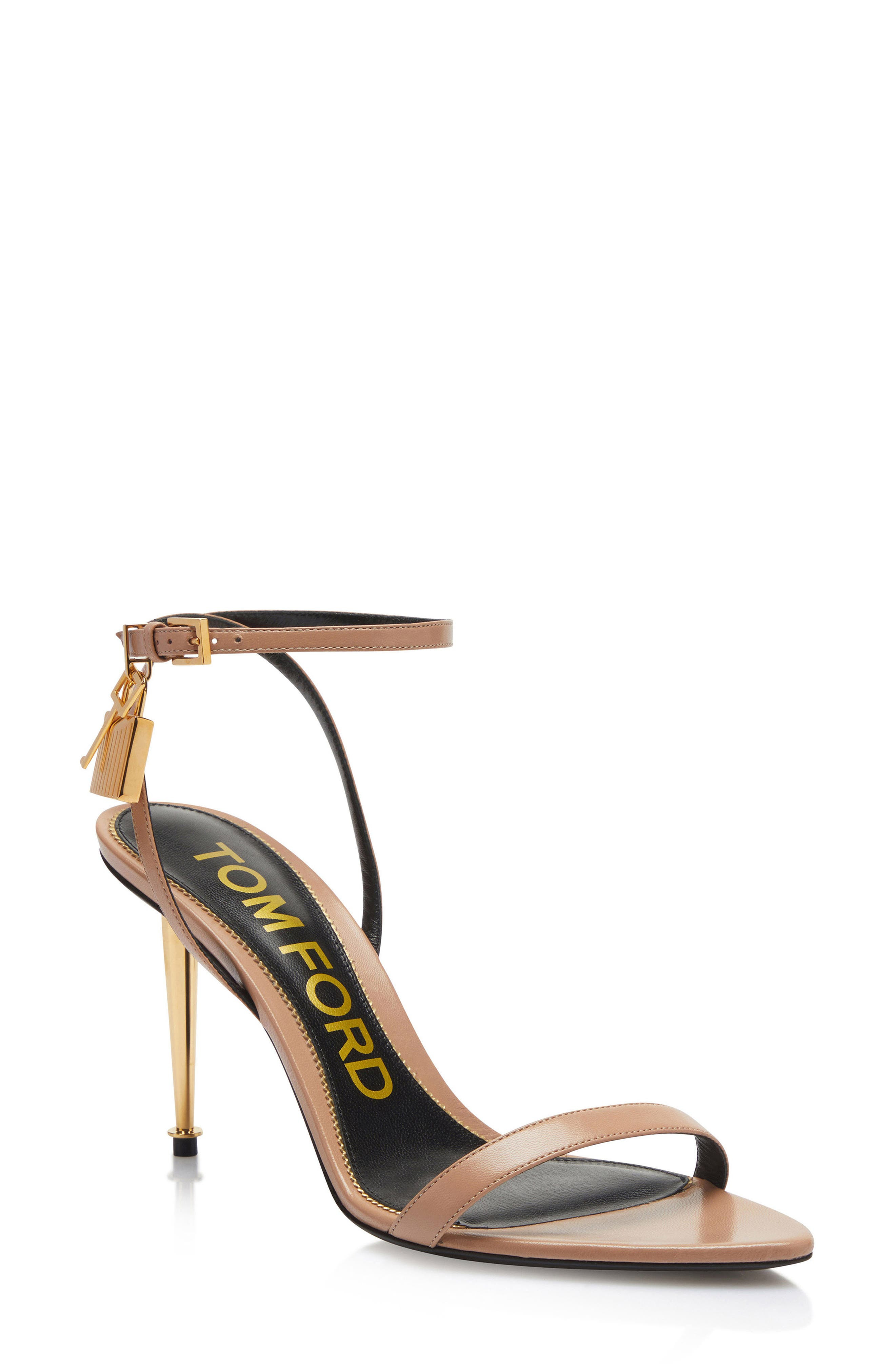 An iconic spike heel and textured padlock bring signature flair to a barely there pointy-toe sandal crafted of supple goatskin leather. 3 1/2" (89mm) heel ( size 39 ) Adjustable ankle strap with buckle closure Leather upper, lining and sole Made in Italy Women's Designer Shoes