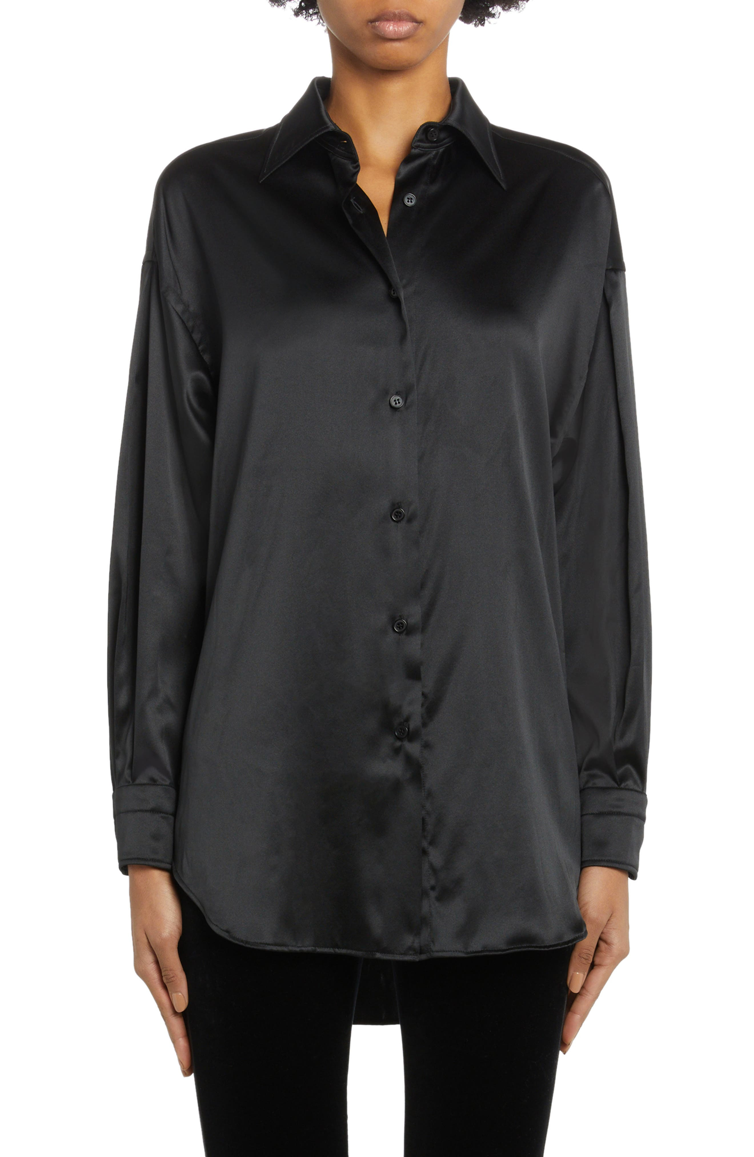 Lustrous silk enhanced with stretch lends beautiful drape to this relaxed-fit blouse detailed with glossy mother-of-pearl buttons and a curved hem. 34 1/2" length (size 48) Front button closure Point collar Long sleeves with button cuffs Curved hem 94% silk, 6% elastane Dry clean Made in Italy Women's Designer Clothing