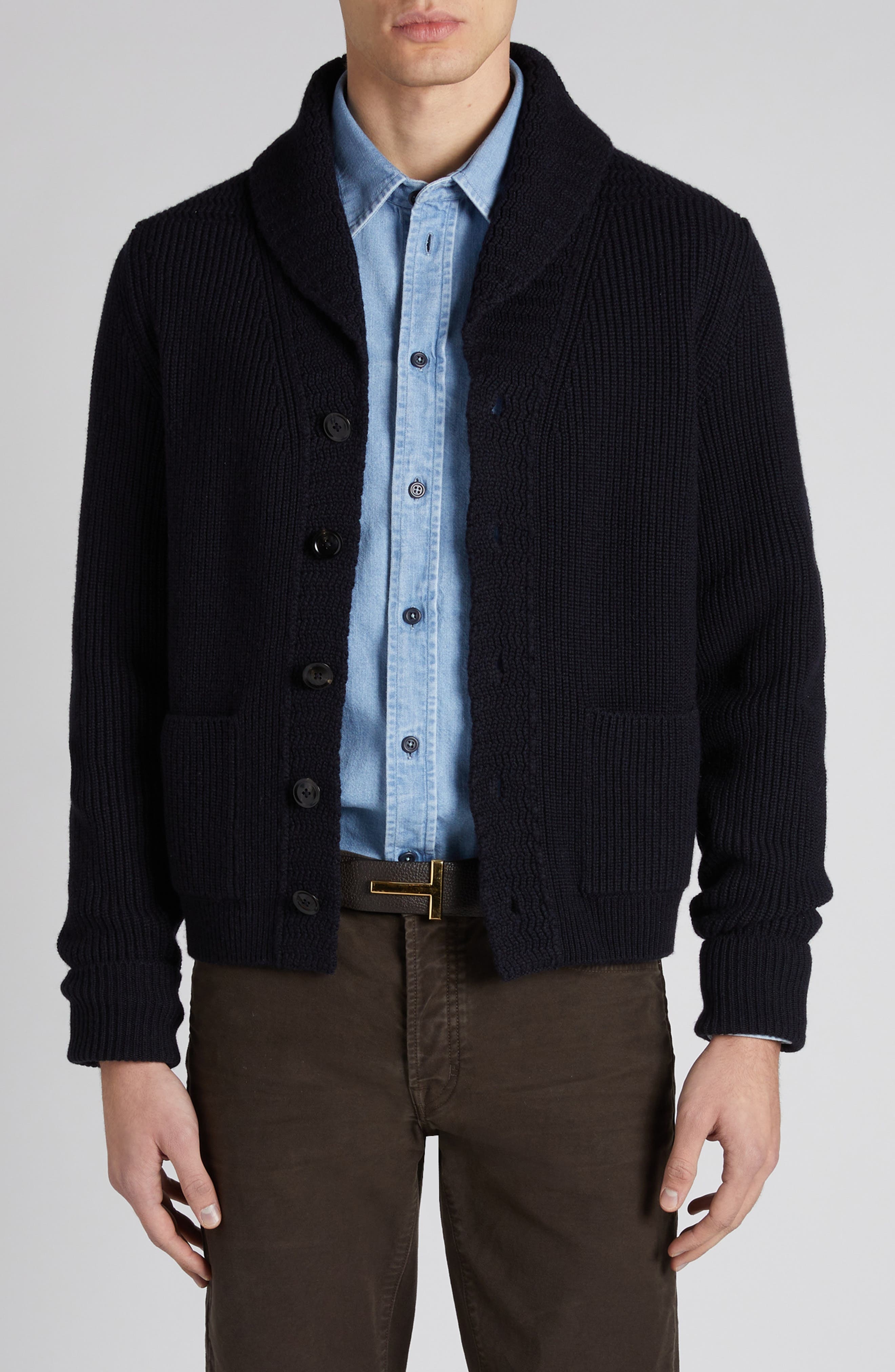 Supersoft Italian cashmere furthers the luxe look and feel of this handsome shawl-collar cardigan. 26 1/2" length (size 50 EU) Front button closure Shawl collar Long sleeves Ribbed cuffs and hem Front patch pockets 100% cashmere Dry clean Made in Italy Designer Clothing