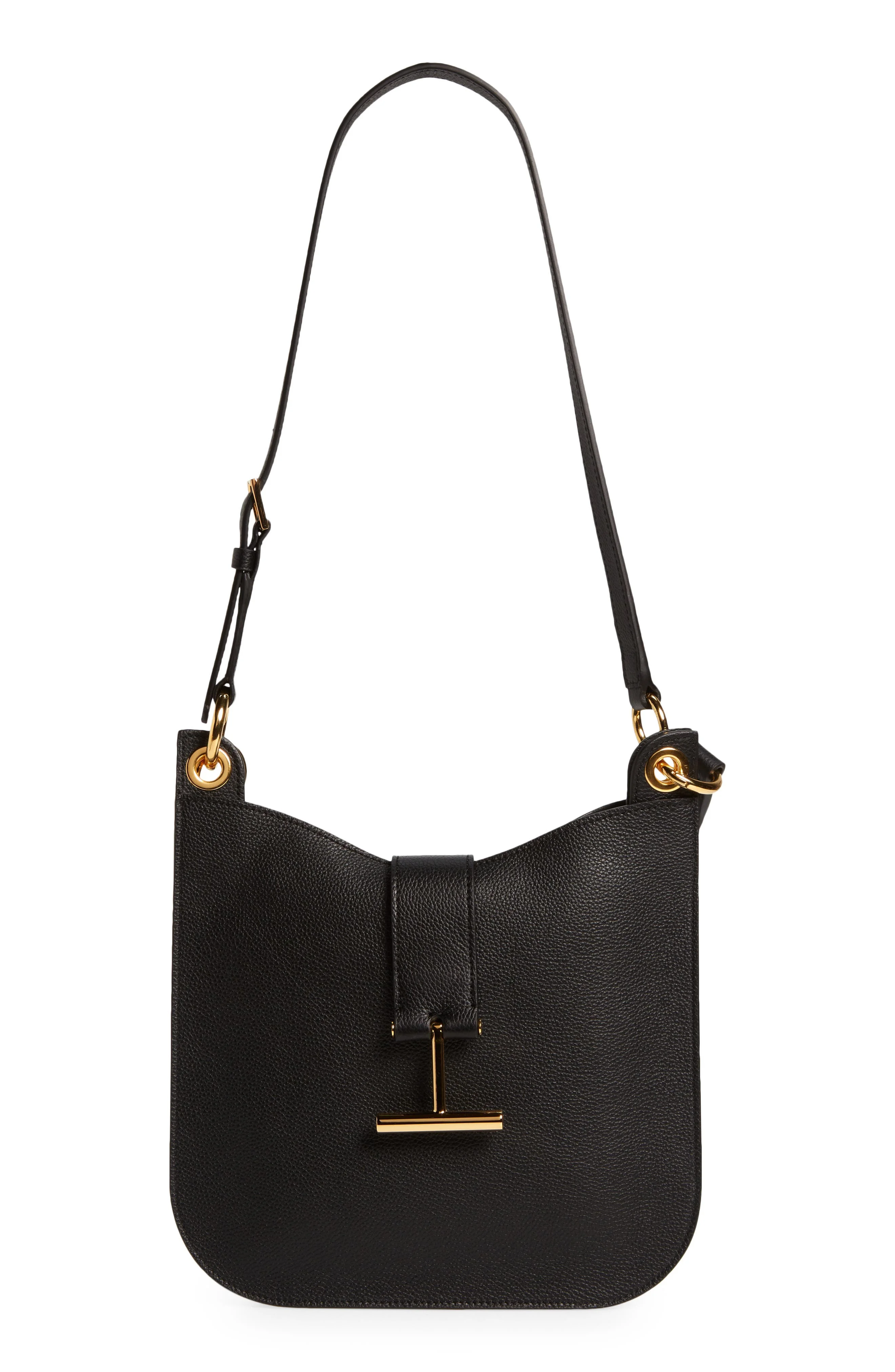 Signature T-shaped hardware brings discreet branding to an iconic Tom Ford top-handle bag crafted of beautifully grained leather. A detachable strap that easily converts for shoulder to crossbody wear offers another carrying option for styling versatility. Magnetic-snap tab closure Adjustable top-carry handle; removable, adjustable shoulder strap Interior zip pocket Lined Leather Made in Italy Designer Handbags