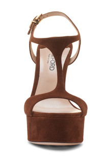 Gleaming logo hardware on the quarter strap subtly brands this goatskin-suede sandal in an elegant T-strap silhouette with a platform balancing the towering block heel. 5" (130mm) heel Adjustable ankle strap with buckle closure Leather upper, lining and sole Made in Italy Designer Shoes