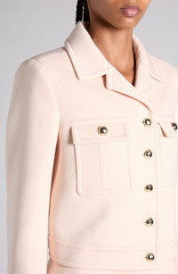 Button-secured flap pockets lend utility appeal to this cropped jacket impeccably tailored from stretch-kissed wool grain de poudre. Front button closure Notched collar Five-button cuffs Chest button-flap patch pockets Lined 98% virgin wool, 2% elastane Dry clean Made in Italy Designer Clothing