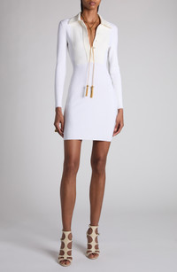 A contrasting placket panel and collar gives a subtle warm hue to a finely ribbed minidress cut to hug. Button half placket Point collar Long sleeves 76% virgin wool, 12% viscose, 9% polyester Dry clean Made in Italy Designer Clothing
