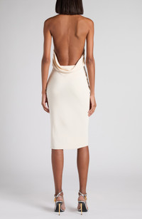 Drapey cowls underline the high neckline and low-cut open back, showcasing the graceful silk-sable fabrication of this halter cocktail dress. Hidden side-zip closure; back neck hook-and-eye closure Halter cowl neck Sleeveless, with cutaway shoulders 100% silk Dry clean Made in Italy Designer Clothing