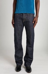 Sitting just above the hips and flaring at the ankles, these jeans cut from first-day-blue cotton denim feature a comfortable fit that relaxes into a classic bootcut profile. Dimensional whiskering provides a lived-in look without compromising the smart, elevated-casual finish. Button fly Five-pocket style 98% cotton, 2% polyurethane Dry clean Made in the USA Designer Clothing