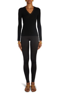 An embroidered logo brands the waistband of signature leggings made in Italy from stretchy jersey fabric. 26 1/2" inseam; 8" leg opening; 10" front rise; 11 1/2" back rise (size X-Small) Elastic waist 68% polyamide, 32% elastane Dry clean Imported Designer Clothing