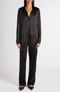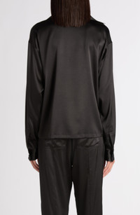 This relaxed top featuring a johnny collar and stretch-kissed silk satin blends retro and sultry influences into one sophisticated package. Dropped shoulders Johnny collar Long sleeves with one-button cuffs 94% silk, 6% elastane Dry clean Made in Italy Designer Clothing