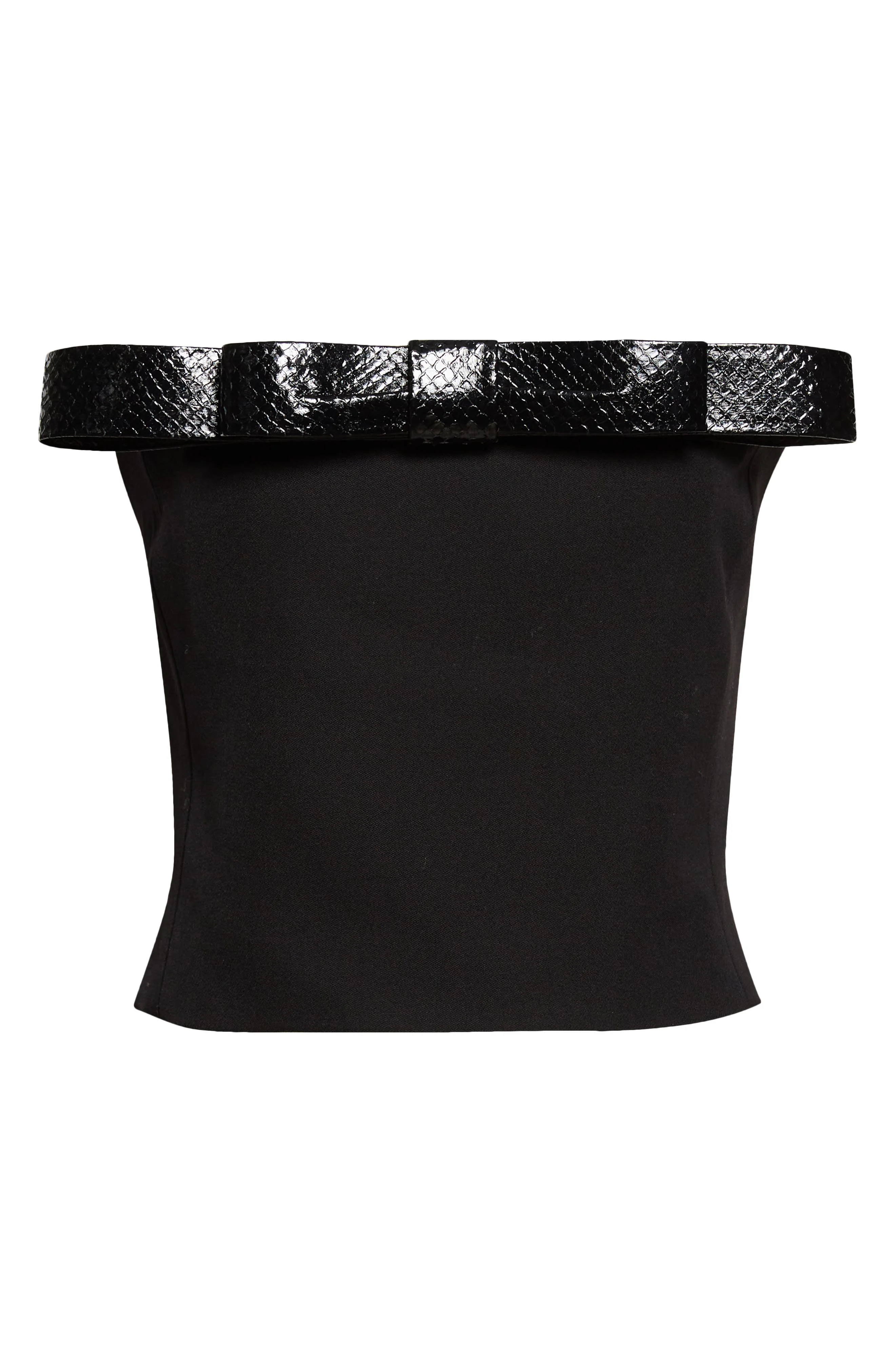 Elegant contrast meets quality craftsmanship on a strapless top that's fashioned from wool grain de poudre and topped with a bow-trimmed band of snakeskin-embossed calfskin. A gliding silk lining brings sumptuous comfort to this Italian-crafted style. Hidden back-zip closure Strapless Silk lining 100% virgin wool with leather trim Dry clean Made in Italy Designer Clothing